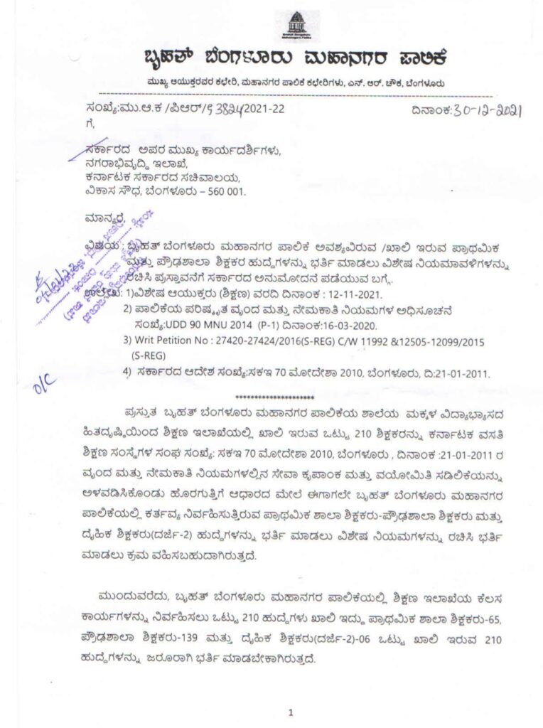 31-12-2021ರಂದು ಪಾಲಿಕೆ ಮುಖ್ಯ ಆಯುಕ್ತರು ನಗರಾಭಿವೃದ್ಧಿ ಇಲಾಖೆಗೆ ಪಾಲಿಕೆಯ ಶಿಕ್ಷಣ ಇಲಾಖೆಯ ಕೆಲಸ ಕಾರ್ಯಗಳನ್ನು ನಿರ್ವಹಿಸಲು ಖಾಲಿಯಿರುವ 210 ಹುದ್ದೆಗಳನ್ನು ವೃಂದ ಮತ್ತು ನೇಮಕಾತಿ ನಿಯಮಗಳ ಸೇವಾ ಕೃಪಾಂಕ ಹಾಗೂ ವಯೋಮಿತಿ ಸಡಲಿಕೆಯನ್ನು ಪಾಲಿಕೆ ವಿಶೇಷ ನಿಯಮಾವಳಿಗಳಲ್ಲಿ ಅಳವಡಿಸಿಕೊಂಡು ರಚಿಸಿಕೊಂಡು ಅನುಮೋದನೆಗಾಗಿ ಪ್ರಸ್ತಾವನೆ ಸಲ್ಲಿಸಲಾಗಿತ್ತು. ಆದರೆ ಈತನಕ ಸರ್ಕಾರದಿಂದ ಒಪ್ಒಇಗೆ ದೊರತಿಲ್ಲ ಎಂದು ಪಾಲಿಕೆ ಅಧಿಕಾರಿಯೊಬ್ಬರು ಹೇಳಿದ್ದಾರೆ.