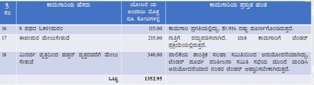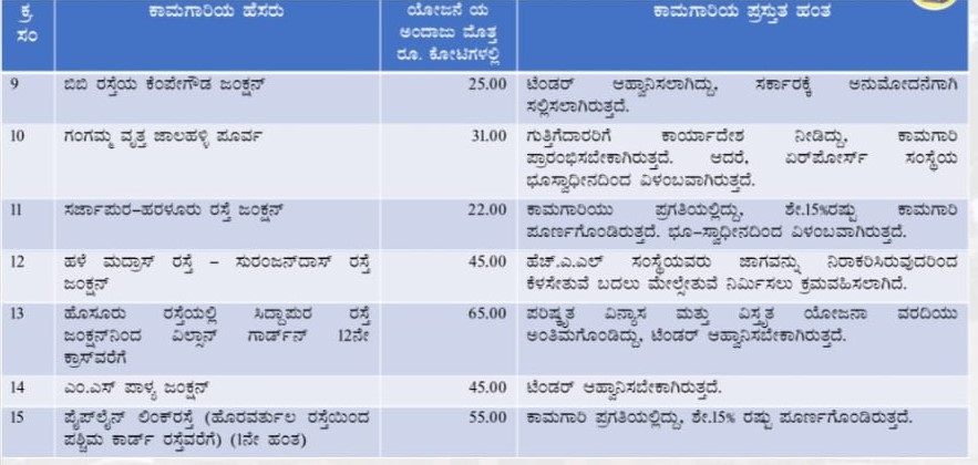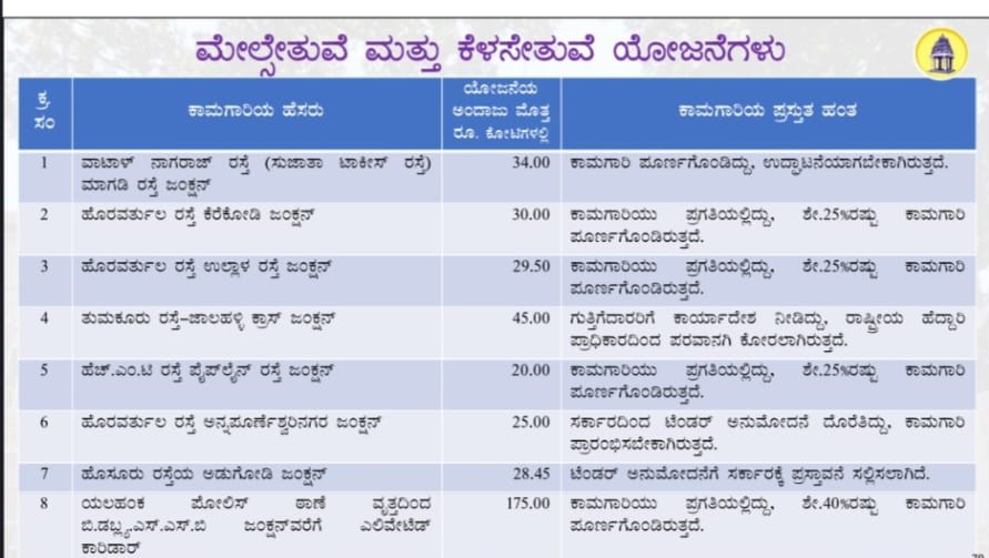 ನಗರದ ಹಲವು ಕಡೆಗಳಲ್ಲಿ ನಡೆಯುತ್ತಿರುವ ಫ್ಲೈಓವರ್, ಅಂಡರ್ ಪಾಸ್ ಹಾಗೂ ಗ್ರೇಡ್ ಸಪರೇಟರ್ ಗಳ ವಿವರ ಈ ಕೆಳಕಂಡಂತಿದೆ :