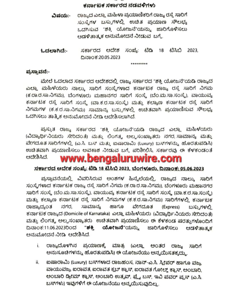 ಪ್ರಸ್ತುತ ರಾಜ್ಯ ಸರ್ಕಾರದ ‘ಶಕ್ತಿ ಯೋಜನೆಯಡಿ ರಾಜ್ಯದ ಎಲ್ಲಾ ಮಹಿಳೆಯರು (ವಿದ್ಯಾರ್ಥಿನಿಯರು ಸೇರಿದಂತೆ) ಮತ್ತು ಲಿಂಗತ್ವ ಅಲ್ಪಸಂಖ್ಯಾತರು, ನಗರ, ಸಾಮಾನ್ಯ ಮತ್ತು ವೇಗಧೂತ ಸಾರಿಗೆಗಳಲ್ಲಿ (ಎ.ಸಿ ಬಸ್ ಮತ್ತು ಐಷಾರಾಮಿ (Luxury) ಬಸ್ಗಳನ್ನು ಹೊರತುಪಡಿಸಿ) ಉಚಿತವಾಗಿ ಪ್ರಯಾಣಿಸಲು ಅವಕಾಶ ನೀಡುವ ಬಗ್ಗೆ ಪರಿಶೀಲಿಸಿ, ಸರ್ಕಾರವು ಈ ಕೆಳಕಂಡ ಷರತ್ತುಗಳನ್ನು ವಿಧಿಸಿ ಆದೇಶಿಸಿದೆ :