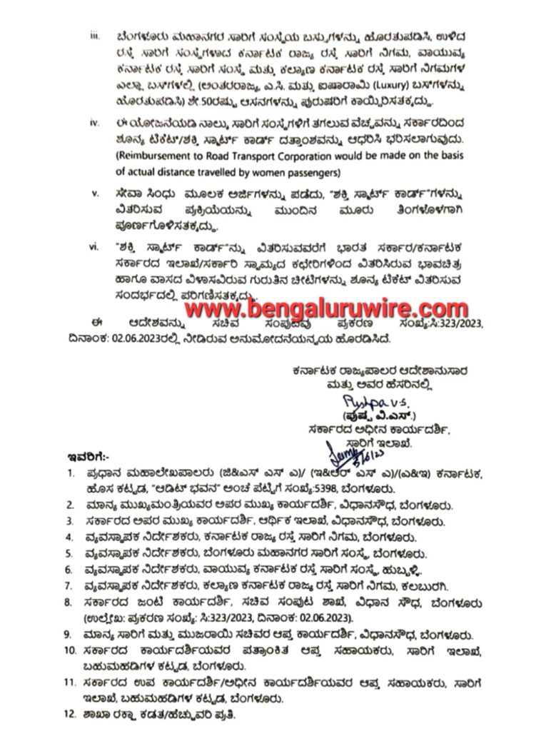 5. ಫಲಾನುಭವಿಗಳಿಂದ ಸೇವಾ ಸಿಂಧು ಮೂಲಕ ಅರ್ಜಿಗಳನ್ನು ಪಡೆದು, “ಶಕ್ತಿ ಸ್ಮಾರ್ಟ್ ಕಾರ್ಡ್ ಗಳನ್ನು ವಿತರಿಸುವ ಪ್ರಕ್ರಿಯೆಯನ್ನು ಮುಂದಿನ ಮೂರು ತಿಂಗಳೊಳಗಾಗಿ ಪೂರ್ಣಗೊಳಿಸತಕ್ಕದ್ದು.