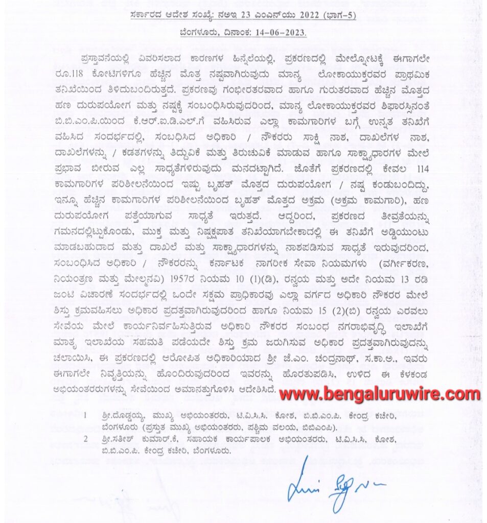 ಈ ದೂರಿನ ಆಧಾರದ ಮೇಲೆ ಲೋಕಾಯುಕ್ತ ಪ್ರಾಥಮಿಕ ತನಿಖೆ ನಡೆಸಿದಾಗ ಮೇಲ್ನೋಟಕ್ಕೆ 114 ಕಾಮಗಾರಿಗಳ ಪರಿಶೀಲನೆಯಿಂದ 118 ಕೋಟಿ ರೂ. ನಷ್ಟವಾಗಿರುವುದು ಕಂಡು ಬಂದಿದೆ. ಅಲ್ಲದೆ ಅಧಿಕಾರಿಗಳು ಸಾಕ್ಷಿ ನಾಶ, ದಾಖಲೆಗಳ ನಾಶ, ಕಡತಗಳ ತಿದ್ದುಪಡಿ, ತಿರುಚುವಿಕೆ ಪತ್ತೆಯಾಗಿದೆ ಎಂದು ನಗರಾಭಿವೃದ್ಧಿ ಇಲಾಖೆ ತನ್ನ ಆದೇಶದಲ್ಲಿ ತಿಳಿಸಿದೆ.