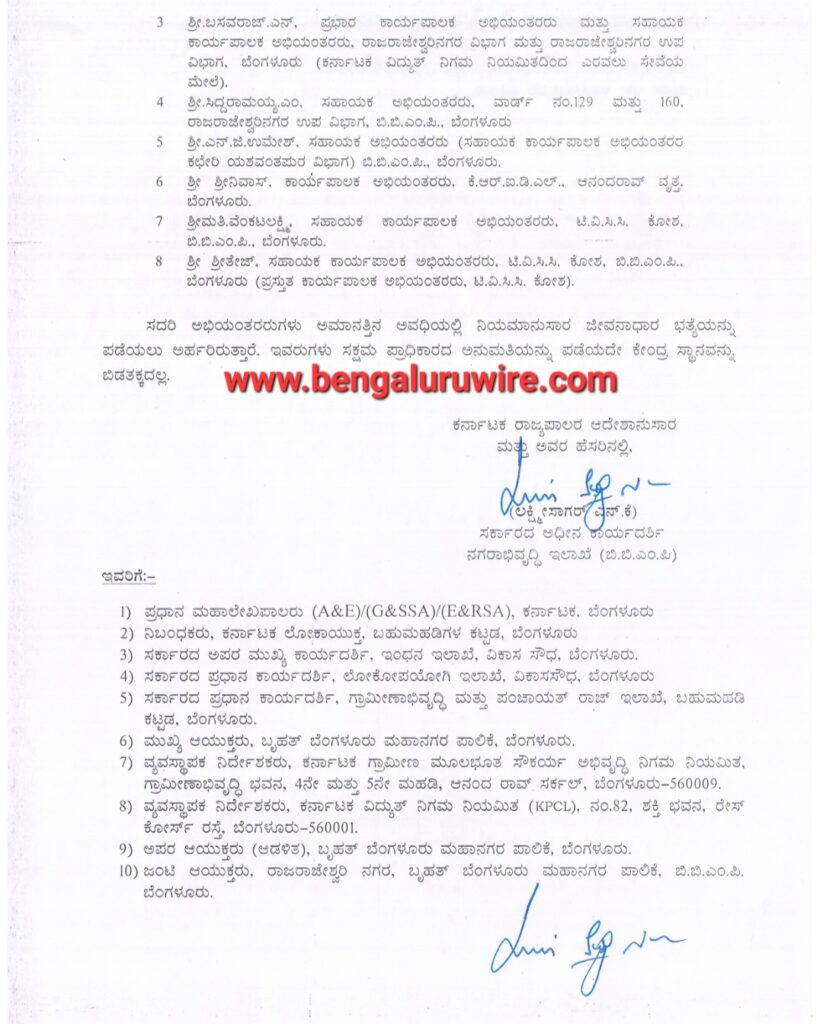 ಲೋಕಾಯಕ್ತ ವರದಿಯನ್ವಯ ಎಇಇ ಜೆ.ಎಂ.ಚಂದ್ರನಾಥ್ ಈಗಾಗಲೇ ನಿವೃತ್ತಿಯಾಗಿರುವುದರಿಂದ ಅವರನ್ನು ಹೊರತುಪಡಿಸಿ, 8 ಎಂಜಿನಿಯರ್ ಗಳನ್ನು ನಗರಾಭಿವೃದ್ಧಿ ಇಲಾಖೆಯ ಅಧೀನ ಕಾರ್ಯದರ್ಶಿ ಅಮಾನತ್ತು ಮಾಡಿ ಆದೇಶಿಸಿದ್ದಾರೆ.