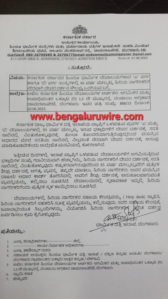 ಈ ಮೂಲಕ ರಾಜ್ಯದ ಹಿರಿಯ ನಾಗರೀಕರಿಗೆ ಆದಷ್ಟು ಶೀಘ್ರವಾಗಿ ಯಾವುದೇ ರೀತಿಯಲ್ಲಿ ಗಂಟೆಗಟ್ಟಲೆ ಕಾಯುವ ಪರಿಸ್ಥಿತಿಯನ್ನು ಧಾರ್ಮಿಕ ದತ್ತಿ ಇಲಾಖೆ ನಿವಾರಿಸಿದೆ. ಈ ಕುರಿತಂತೆ ಧಾರ್ಮಿಕ ದತ್ತಿ ಇಲಾಖೆಯ ಆಯುಕ್ತರಾದ ಬಸವರಾಜೇಂದ್ರ ಜೂ.21ರಂದು ಸುತ್ತೋಲೆ ಹೊರಡಿಸಿದ್ದಾರೆ.