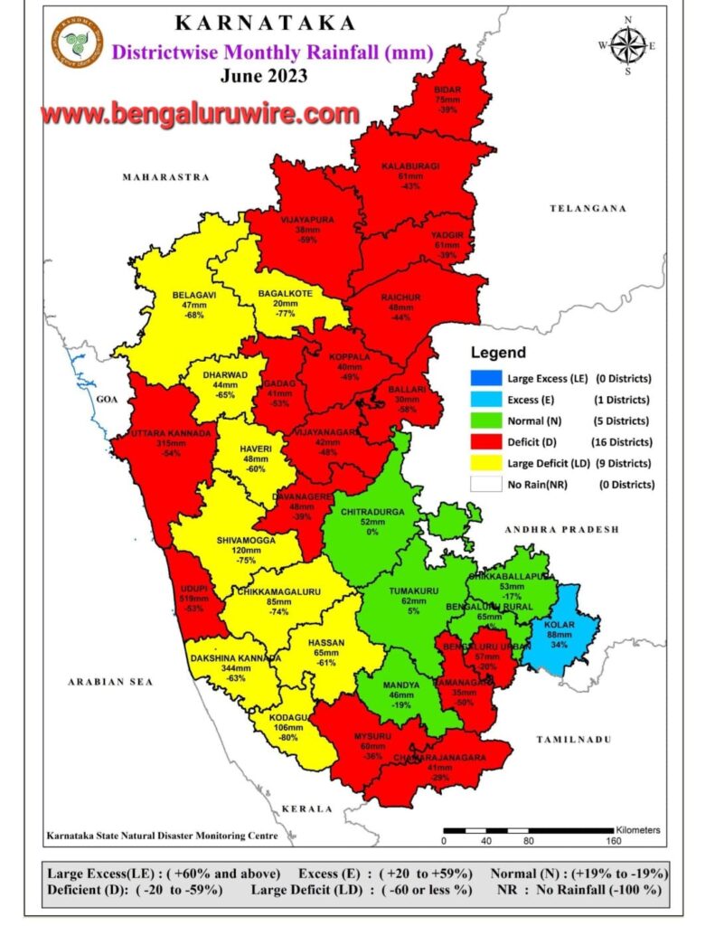 ಕರ್ನಾಟಕ ನೈಸರ್ಗಿಕ ವಿಕೋಪ ಉಸ್ತುವಾರಿ ಕೇಂದ್ರ (KSNDMC) ವರದಿಯ ಪ್ರಕಾರ ಜೂನ್ ತಿಂಗಳಿನಲ್ಲಿ ರಾಜ್ಯದ 16 ಜಿಲ್ಲೆಗಳಲ್ಲಿ ಕೊರತೆಯಿರುವುದಾಗಿ ತಿಳಿಸಿದೆ. ಅದರಲ್ಲೂ 9 ಜಿಲ್ಲೆಗಳಲ್ಲಿ ತೀವ್ರ ಮಳೆಯ ಅಭಾವವಿದೆ. ಕೇವಲ ಕೋಲಾರ ಜಿಲ್ಲೆಯಲ್ಲಿ ಮಾತ್ರ ವಾಡಿಕೆಗಿಂತ ಹೆಚ್ಚುವರಿಯಾಗಿ ಶೇ.34ರಷ್ಟು ಅಂದರೆ 88 ಮಿ.ಮೀ ಮಳೆಯಾಗಿದೆ. ಉಳಿದಂತೆ ಚಿತ್ರದುರ್ಗ, ತುಮಕೂರು, ಚಿಕ್ಕಮಗಳೂರು, ಮಂಡ್ಯ ಹಾಗೂ ಬೆಂಗಳೂರು ಗ್ರಾಮಾಂತರ ಜಿಲ್ಲೆಗಳಲ್ಲಿ ಸಾಮಾನ್ಯ ಮಳೆಯಾಗಿದೆ ಎಂದು ಹೇಳಿದೆ.