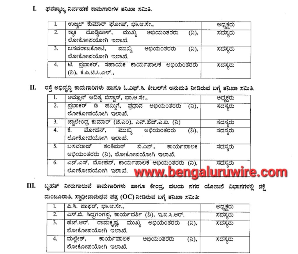 ಇನ್ನು ಬೃಹತ್ ನೀರುಗಾಲುವೆ ಕಾಮಗಾರಿಗಳು, ಕೇಂದ್ರ, ವಲಯ ನಗರ ಯೋಜನೆ ವಿಭಾಗಗಳಲ್ಲಿ ನಕ್ಷೆ ಮಂಜೂರಾತಿ, ಸ್ವಾಧೀನಾನುಭವ ಪತ್ರ (OC) ನೀಡಿರುವ ಬಗ್ಗೆ ಐಎಎಸ್ ಅಧಿಕಾರಿ ಪಿ.ಸಿ.ಜಾಫರ್ ಅಧ್ಯಕ್ಷತೆಯ ನಾಲ್ವರ ಸಮತಿಯನ್ನು ಸರ್ಕಾರವು ರಚನೆ ಮಾಡಿದೆ. ಜೊತೆಗೆ ಕೆರೆ ಅಭಿವೃದ್ಧಿ ಕಾಮಗಾರಿಗಳು ಹಾಗೂ ಸ್ಮಾರ್ಟ್ ಸಿಟಿ ಯೋಜನೆಗಳಲ್ಲಿ ಕೈಗೊಂಡಿರುವ ಕಾಮಗಾರಿಗಳು ಮತ್ತು ವಾರ್ಡ್ ಮಟ್ಟದ ಕಾಮಗಾರಿಗಳ ತನಿಖೆ ನಡೆಸಲು ಡಾ.ವಿಶಾಲ್ ಅಧ್ಯಕ್ಷತೆಯಲ್ಲಿ ಆರು ಮಂದಿಯ ತನಿಖಾ ಸಮಿತಿಯನ್ನು ಸರ್ಕಾರ ರಚಿಸಿ ಆದೇಶ ಹೊರಡಿಸಿದೆ.