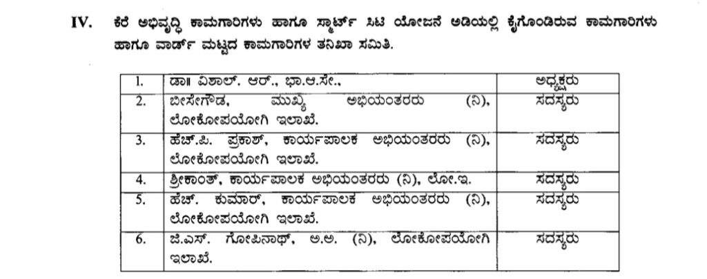 ಇದಲ್ಲದೇ ಕೆರೆಗಳ ಅಭಿವೃದ್ಧಿ ಕಾಮಗಾರಿಗಳು. ಸ್ಮಾರ್ಟ್ ಸಿಟಿ ಯೋಜನೆಯಡಿಯಲ್ಲಿನ ಕಾಮಗಾರಿಗಳು ಮತ್ತು ವಾರ್ಡ್ ಮಟ್ಟದ ಕಾಮಗಾರಿಗಳಲ್ಲಿ ನಡೆದಿದೆ ಎನ್ನಲಾದ ಅಕ್ರಮಗಳ ಕುರಿತಾದ ದೂರು ಪ್ರಕರಣಗಳನ್ನು ಸಹಜ ನ್ಯಾಯ ತತ್ವದ ಅಡಿಯಲ್ಲಿ ಗಂಭೀರ ಪ್ರಕರಣವೆಂದು ಪರಿಗಣಿಸಿ ಸರ್ಕಾರವು ಬಾಹ್ಯ ಮೂಲದ ಹಿರಿಯ ಅಧಿಕಾರಿಗಳ ನೇತೃತ್ವದಲ್ಲಿ ಆಯಾ ವಿಷಯ ವ್ಯಾಪ್ತಿಗೊಳಪಟ್ಟಂತೆ ಸಮಿತಿ ರಚಿಸಿದೆ. ಈ ಸಮಿತಿಯಲ್ಲಿ ಪರಿಣಿತರು, ತಜ್ಞರುಗಳನ್ನು ನೇಮಿಸಿ ತನಿಖಾ ಸಮಿತಿಗಳಿಂದ ಸ್ವತಂತ್ರ ವಿಚಾರಣೆ ನಡೆಸಲಾಗುತ್ತದೆ ಎಂದು ನಗರಾಭಿವೃದ್ಧಿ ಇಲಾಖೆಯು ತನ್ನ ಆದೇಶದಲ್ಲಿ ತಿಳಿಸಿದೆ.