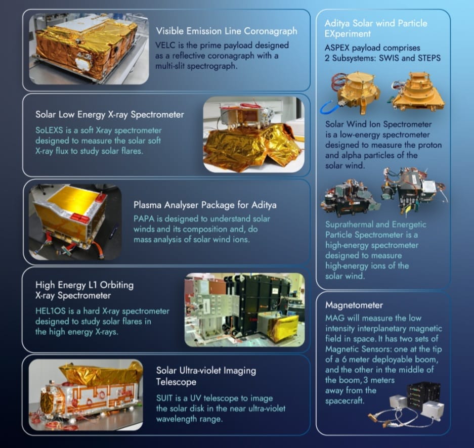 ಸೂರ್ಯನ ಅಧ್ಯಯನದ ಭಾರತದ ಪ್ರಥಮ ಬಾಹ್ಯಾಕಾಶ ಯೋಜನೆ ಆದಿತ್ಯ ಎಲ್-1 ವೀಕ್ಷಣಾಲಯದಲ್ಲಿ ಒಟ್ಟು ಏಳು ಉಪಕರಣಗಳಿವೆ (Payloads). ನಾಲ್ಕು ನೇರವಾಗಿ ಸೂರ್ಯನನ್ನು ಅಭಿಮುಖವಾಗಿದ್ದರೆ, ಉಳಿದ ಮೂರು ಉಪಕರಣಗಳು ಲಾಂಗ್ರೇಜಿಯನ್ ಬಿಂದುವಿನತ್ತ ಸೂರ್ಯನಿಂದ ಹರಿದುಬರುವ ಕಣ ಮತ್ತು ಕ್ಷೇತ್ರಗಳನ್ನು ಆಯಾ ಕ್ಷಣದಲ್ಲೇ ಅಭ್ಯಸಿಸಿ ಮಾಹಿತಿ ನೀಡುತ್ತದೆ.