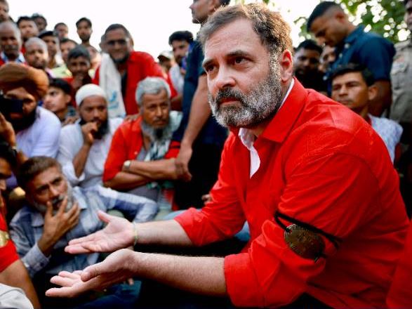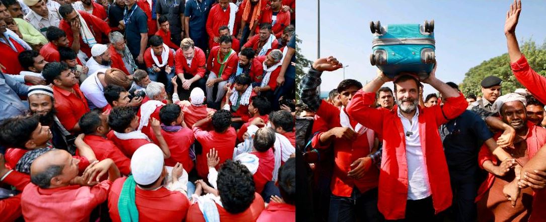 ದೆಹಲಿಯ ಆನಂದ ವಿಹಾರ ರೈಲು ನಿಲ್ದಾಣದಲ್ಲಿ ಹಮಾಲಿಗಳ ಧಿರಿಸು ಹಾಕಿ ಕೂಲಿಗಳೊಂದಿಗೆ ಮಾತನಾಡುತ್ತಿರುವ ರಾಹುಲ್ ಗಾಂಧಿಯವರ ಚಿತ್ರ.