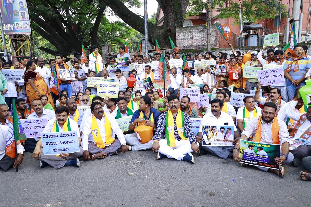 ಕಾವೇರಿ ನೀರಿನ ವಿಚಾರವೂ ಸೇರಿ ವಿವಿಧ ರಂಗಗಳಲ್ಲಿ ರಾಜ್ಯ ಸರಕಾರದ ವೈಫಲ್ಯವನ್ನು ಖಂಡಿಸಿ ಬಿಜೆಪಿ ವತಿಯಿಂದ ಶನಿವಾರ, ಬೆಂಗಳೂರಿನ ಮೈಸೂರು ಬ್ಯಾಂಕ್ ವೃತ್ತದಲ್ಲಿ ಖಾಲಿ ಬಿಂದಿಗೆ ಹಿಡಿದು ಬೃಹತ್ ಪ್ರತಿಭಟನೆ ನಡೆಸಲಾಯಿತು.