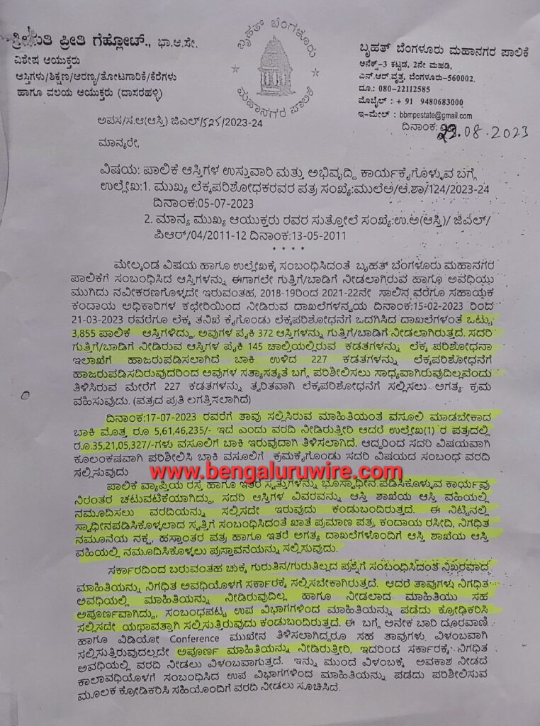 ಇನ್ನೊಂದು ಗಂಭೀರವಾದ ವಿಷಯ ಏನಪ್ಪಾ ಅಂದರೆ, ಪಾಲಿಕೆ ವ್ಯಾಪ್ತಿಯ ಸಹಾಯಕ ಕಂದಾಯ ಇಲಾಖೆ ಅಧಿಕಾರಿ (ARO)ಗಳ ಕಚೇರಿಯಿಂದ ನೀಡಿರುವ ದಾಖಲೆಗಳ ಅನ್ವಯ ಈ ವರ್ಷದ ಫೆ.15 ರಿಂದ ಒಂದು ವಾರಗಳ ಕಾಲ ಲೆಕ್ಕ ತನಿಖೆ ಕೈಗೊಂಡಾಗ ನಗರದಲ್ಲಿ ಒಟ್ಟು 3,855 ಪಾಲಿಕೆ ಆಸ್ತಿಗಳಿದ್ದು, ಅವುಗಳ ಪೈಕಿ 372 ಆಸ್ತಿಗಳನ್ನು ಬಿಬಿಎಂಪಿಯು ವಿವಿಧ ಸಂಘ ಸಂಸ್ಥೆ, ಸರ್ಕಾರಿ ಇಲಾಖೆ ಹಾಗೂ ವ್ಯಕ್ತಿಗಳಿಗೆ ಗುತ್ತಿಗೆ ಹಾಗೂ ಬಾಡಿಗೆಗೆ ನೀಡಿದೆ. ಆದರೆ ಸಹಾಯಕ ಕಂದಾಯ ಇಲಾಖೆ ಅಧಿಕಾರಿಗಳು ಹೀಗೆ ಗುತ್ತಿಗೆ ಹಾಗೂ ಬಾಡಿಗೆಗೆ ನೀಡಿರುವ ಆಸ್ತಿಗಳ ಪೈಕಿ ಕೇವಲ 145 ಆಸ್ತಿಗಳ ಕಡತಗಳನ್ನಷ್ಟೇ ಲೆಕ್ಕ ಪರಿಶೋಧನಾ ಇಲಾಖೆಗೆ ಹಾಜರುಪಡಿಸಿದೆ. ಆದರೆ ಉಳಿದ 227 ಕಡತಗಳನ್ನು ಆಡಿಟ್ ಮಾಡಲು ಫೈಲ್ ಗಳನ್ನು ಕೊಟ್ಟೇ ಇಲ್ಲ. ಹೀಗಾಗಿ ಸಂಪೂರ್ಣವಾಗಿ ಲೆಕ್ಕಪರಿಶೋಧನೆ ಮಾಡಲು ಸಾಧ್ಯವಾಗಿಲ್ಲ. ಹೀಗಾಗಿ 227 ಕಡತಗಳನ್ನು ಲೆಕ್ಕಪರಿಶೋಧನೆಗೆ ಸಲ್ಲಿಸಿ, ಬಾಡಿಗೆ, ಗುತ್ತಿಗೆ ಮೊತ್ತ ವಸೂಲಿಗೆ ಕ್ರಮ ಕೈಗೊಂಡು ವರದಿ ನೀಡುವಂತೆ ಎಂದು ವಿಶೇಷ ಆಯುಕ್ತರು ಎಲ್ಲಾ ವಲಯದ ಜಂಟಿ ಆಯುಕ್ತರಿಗೆ ಬರೆದ ಪತ್ರದಲ್ಲಿ ತಿಳಿಸಿದ್ದಾರೆ.