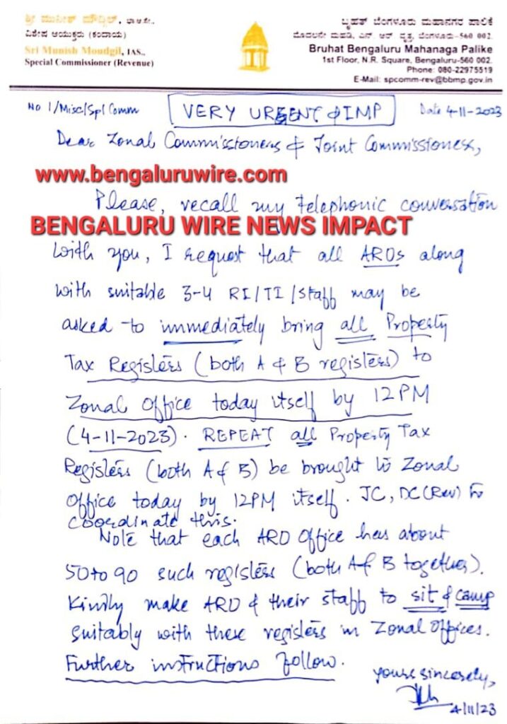 ಈ ಸುದ್ದಿಯಿಂದ ಎಚ್ಚೆತ್ತುಕೊಂಡು ಪಾಲಿಕೆ ಕಂದಾಯ ವಿಭಾಗ ವಿಶೇಷ ಆಯುಕ್ತ ಮುನೀಷ್ ಮೌದ್ಗಿಲ್ ನ.3ರಂದೇ ರಾತ್ರಿ ಎಲ್ಲಾ ವಲಯದ ಆಯುಕ್ತರು ಹಾಗೂ ಜಂಟಿ ಆಯುಕ್ತರಿಗೆ ಬೆಂಗಳೂರು ವೈರ್ “BW INVESTIGATION | ಬೋಗಸ್ ಖಾತೆ- ಬಂಡಲ್ ಭ್ರಷ್ಟರು ಭಾಗ-1 | ಬಿಬಿಎಂಪಿ ಯಲಚೇನಹಳ್ಳಿ ಎಆರ್ ಒ ಕಚೇರಿ : ಬ್ರೋಕರ್ – ಡೂಪ್ಲಿಕೇಟ್ ಖಾತಾ ಫ್ಯಾಕ್ಟರಿ : ಬೆಂಗಳೂರು ವೈರ್ ತನಿಖೆಯಲ್ಲಿ ಬಯಲಾಯ್ತು ನಕಲಿ ಖಾತೆಗಳು” ಎಂಬ ಶೀರ್ಷಿಕೆಯಲ್ಲಿ ಪ್ರಕಟಿಸಿದ ಸುದ್ದಿಯನ್ನು ಗಂಭೀರವಾಗಿ ಪರಿಗಣಿಸಿ ಅವುಗಳನ್ನು ರವಾನಿಸಿದ್ದಾರೆ. ಅಲ್ಲದೆ ಇದರ ಹಿಂದೆಯೇ ತುರ್ತಾಗಿ ನ.4ರ ದಿನಾಂಕ ನಮೂದಿಸಿ, ಕೈಬರಹದಲ್ಲೆ ಪತ್ರ ಬರೆದು ಅದೇ ದಿನ ರಾತ್ರಿ, ನ.4ರ ಮಧ್ಯಾಹ್ನ 12 ಗಂಟೆಯೊಳಗೆ ಎಲ್ಲಾ 64 ಸಹಾಯಕ ಕಂದಾಯ ಅಧಿಕಾರಿಗಳ ಕಚೇರಿಯಲ್ಲಿನ ಎ ಮತ್ತು ಬಿ ಸ್ವತ್ತಿನ ಟ್ಯಾಕ್ಸ್ ರಿಜಿಸ್ಟರ್ ಅನ್ನು ಆಯಾ ವಲಯ ಕಚೇರಿಗೆ ತಪ್ಪದೇ ಹಸ್ತಾಂತರಿಸುವಂತೆ ಇದೇ ಮೇಲ್ಕಂಡ ಅಧಿಕಾರಿಗಳಿಗೆ ಖಡಕ್ ಆದೇಶ ಹೊರಡಿಸಿದ್ದರು ಎಂದು ಉನ್ನತ ಮೂಲಗಳು ಖಚಿತಪಡಿಸಿವೆ.