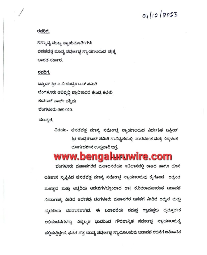 ಬೆಂಗಳೂರು, ಡಿ.09 www.bengaluruwire.com : ಬೆಂಗಳೂರು ಅಭಿವೃದ್ಧಿ ಪ್ರಾಧಿಕಾರ (BDA) ನಿರ್ಮಿಸುತ್ತಿರುವ ಡಾ.ಕೆ.ಶಿವರಾಮ ಕಾರಂತ ಬಡಾವಣೆ (Dr.K.Shivarama Karanth Layout)ಯ ಉಸ್ತುವಾರಿಗಾಗಿ ಸುಪ್ರೀಂಕೋರ್ಟ್ ನೇಮಿಸಿದ್ದ ನ್ಯಾಯಮೂರ್ತಿ ಚಂದ್ರಶೇಖರ್ ಅಧ್ಯಕ್ಷತೆಯ ಸಮಿತಿ (Justice A.V.Chandrashekar Committee –ಜೆಸಿಸಿ) ಅವಧಿ ಇದೇ ಡಿಸೆಂಬರ್ ನಲ್ಲಿ ಮುಕ್ತಾಯವಾಗಲಿದೆ. ರೈತರಿಗೆ ಭೂಪರಿಹಾರ ನೀಡುವ ತನಕ ಅಥವಾ ಮತ್ತೊಂದು ವರ್ಷ ಸಮಿತಿ ಕಾರ್ಯಾವಧಿಯನ್ನು ವಿಸ್ತರಣೆ ಮಾಡುವಂತೆ ಬಡಾವಣೆಗೆ ಜಮೀನು ಬಿಟ್ಟುಕೊಟ್ಟ ರೈತರು ಸರ್ವೋಚ್ಛ ನ್ಯಾಯಾಲಯಕ್ಕೆ ಪತ್ರ ಬರೆದು ಮನವಿ ಮಾಡಿದ್ದಾರೆ.