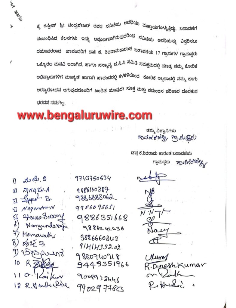ಬಡಾವಣೆಗೆ ಸಂಬಂಧಿಸಿದ ಕೆಲಸಗಳು ಇನ್ನು ಅಪೂರ್ಣವಾಗಿರುವುದರಿಂದ ಸಮಿತಿಯ ಅವಧಿಯನ್ನು ವಿಸ್ತರಿಸುವಂತೆ ಡಾ.ಕೆ. ಶಿವರಾಮಕಾರಂತ ಬಡಾವಣೆಯ 17 ಗ್ರಾಮಗಳ ಗ್ರಾಮಸ್ಥರು ಸುಪ್ರೀಂಕೋರ್ಟಿಗೆ ಒಕ್ಕೊರಲ ಮನವಿ ಮಾಡಿದ್ದಾರೆ. ಸಮಿತಿ ಅವಧಿ ವಿಸ್ತರಿಸದಿದ್ದಲ್ಲಿ ಜೆಸಿಸಿ ಸಮಿತಿಯ ಮೇಲೆ ನಂಬಿಕೆ ಇಟ್ಟು ಬಿಡಿಎಗೆ ಜಮೀನು ಬಿಟ್ಟಕೊಟ್ಟ ರೈತರಿಗೆ ಭೂಪರಿಹಾರ ವಿಚಾರದಲ್ಲಿ ನ್ಯಾಯ ಸಿಗುವುದಿಲ್ಲ. ಹಾಗಾಗಿ ಸಮಿತಿ ಅವಧಿ ವಿಸ್ತರಿಸುವಂತೆ ಕೋರಿದ್ದಾರೆ.