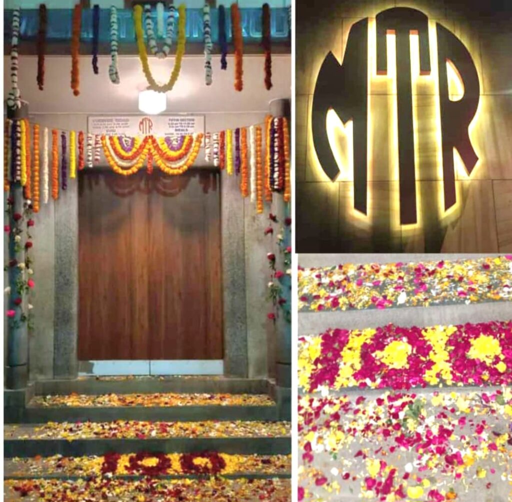 ಬೆಂಗಳೂರಿನ ಪ್ರಸಿದ್ಧ ಮಾವಳ್ಳಿ ಟಿಫನ್ ರೂಮ್ (ಎಂಟಿಆರ್) ಹೋಟೆಲ್ 100 ವರ್ಷ ತಲುಪಿದ ಹಿನ್ನಲೆಯಲ್ಲಿ ಹೋಟೆಲ್ ದ್ವಾರವನ್ನು ಹೂವಿನಿಂದ ಅಲಂಕಾರ ಮಾಡಿರುವ ಚಿತ್ರ.