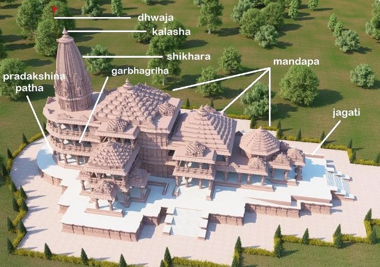 ರಾಮಮಂದಿರದ ಸಂಖ್ಯಾತ್ಮಕ ಆಯಾಮಗಳನ್ನು ಪರಿಶೀಲಿಸಿದರೆ, ಇದು 360 ಅಡಿ ಉದ್ದ ಮತ್ತು 235 ಅಡಿ ಅಗಲವನ್ನು ಹೊಂದಿದೆ. ಶಿಖರವನ್ನು ಒಳಗೊಂಡಂತೆ ಒಟ್ಟು ಎತ್ತರವು 161 ಅಡಿಗಳಷ್ಟು ಎತ್ತರವಾಗಿದೆ. ಮೂರು ಮಹಡಿಗಳು ಮತ್ತು ಒಟ್ಟು 12 ದ್ವಾರಗಳನ್ನು ಹೊಂದಿರುವ ಈ ದೇವಾಲಯವು ವಾಸ್ತುಶಿಲ್ಪದ ಭವ್ಯತೆಗೆ ಭವ್ಯವಾದ ಸಾಕ್ಷಿಯಾಗಿದೆ. ದೇವಾಲಯದ ಗರ್ಭಗೃಹ ಮಧ್ಯದಲ್ಲಿ ಮತ್ತು ಪ್ರವೇಶ ಮಾರ್ಗದಲ್ಲಿ ಐದು ಮಂಟಪಗಳು ನಿರ್ಮಾಣವಾಗಿವೆ. ಕಟ್ಟಡವು ಒಟ್ಟು 366 ಭವ್ಯವಾದ ಕಂಬಗಳನ್ನು ಹೊಂದಿದೆ. ಪ್ರತಿ ಕಂಬಗಳಲ್ಲೂ ತಲಾ 16 ವಿಗ್ರಹಗಳನ್ನು ಕೆತ್ತಲಾಗಿದೆ. ಅದರಲ್ಲಿ ಶಿವನ ಅವತಾರಗಳು, 10 ದಶಾವತಾರಗಳು, 64 ಚೌಸತ್ ಯೋಗಿನಿಗಳ ಶಿಲ್ಪ ಮತ್ತು ಸರಸ್ವತಿ ದೇವಿಯ 12 ಅವತಾರಗಳು ಒಳಗೊಂಡಿವೆ. ದೇವಾಲಯದ ಮುಖ್ಯ ಪ್ರವೇಶದ್ವಾರವು ಪೂರ್ವಾಭಿಮುಖವಾಗಿದ್ದು, ನೆಲಮಟ್ಟದಿಂದ ಸಿಂಹದ್ವಾರದ ಮೂಲಕ 32 ಮೆಟ್ಟಿಲುಗಳನ್ನು ಹತ್ತಿ ದೇವಸ್ಥಾನಕ್ಕೆ ಪ್ರವೇಶಿಸಬಹುದಾಗಿದೆ.