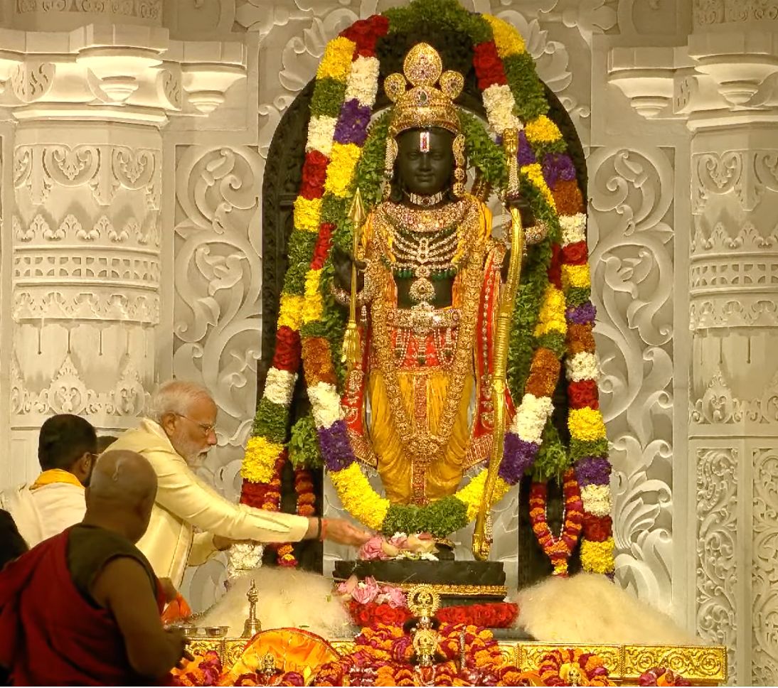 ಇನ್ನೊಂದೆಡೆ ಬೆಂಗಳೂರ ಸೇರಿದಂತೆ ದೇಶ ವಿದೇಶಗಳಲ್ಲಿ ರಾಮನಾಮ ಜಪ, ಭಗವಾಧ್ವಜ ಹಾರಾಡುತ್ತಾ ಶ್ರಿರಾಮನ ಆದರ್ಶ ಎಲ್ಲೆಡೆ ಮತ್ತೊಮ್ಮೆ ಪಸರಿಸಿತು. ದೇಶಾದ್ಯಂತ ಅಯೋಧ್ಯೆಗೆ ಬಂದಿದ್ದ ನೂರಾರು ಸಂತರು, ಮಠಾಧೀಶರು, ಗಣ್ಯರ ಸಮಕ್ಷಮ ಪ್ರಧಾನಮಂತ್ರಿ ನರೇಂದ್ರ ಮೋದಿ ಅವರು, ಇಂದು ಮಧ್ಯಾಹ್ನ 12.15 ರಿಂದ 12.45 ರ ನಡುವೆ ರಾಮ್ ಲಲ್ಲಾ ದೇವಾಲಯದ ಪ್ರತಿಷ್ಠಾಪನೆಯ ಧಾರ್ಮಿಕ ವಿಧಿ ವಿಧಾನಗಳನ್ನು ಪೂರೈಸಿದರು. ಹಿಂದೂ ಪುರಾಣಗಳ ಪ್ರಕಾರ, ಭಗವಾನ್ ರಾಮನು ಅಭಿಜಿತ್ ಮುಹೂರ್ತ, ಮೃಗಶಿರ್ಷ ನಕ್ಷತ್ರ, ಅಮೃತ ಸಿದ್ಧಿ ಯೋಗ ಮತ್ತು ಸರ್ವಾರ್ಥ ಸಿದ್ಧಿ ಯೋಗದ ಸಂಗಮದಲ್ಲಿ ಜನಿಸಿದನೆಂದು ಪ್ರತೀತಿಯಿದೆ.
