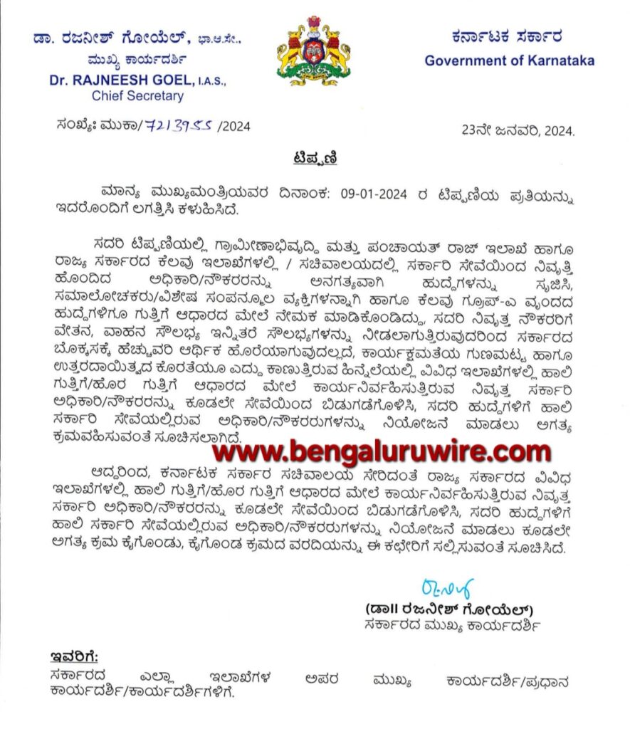 ” ಮುಖ್ಯಮಂತ್ರಿಗಳ ಸೂಚನೆ ಮೇರೆಗೆ ಮುಖ್ಯ ಕಾರ್ಯದರ್ಶಿ ಡಾ.ರಜನೀಶ್ ಗೋಯಲ್, ವಿವಿಧ ಇಲಾಖೆ, ನಿಗಮ ಮಂಡಳಿಗಳಲ್ಲಿ ಅನಗತ್ಯವಾಗಿ ನಿವೃತ್ತ ಸರ್ಕಾರಿ ಅಧಿಕಾರಿ, ನೌಕರರನ್ನು ನೇಮಿಸಿಕೊಂಡಿರುವುದರಿಂದ ಸರ್ಕಾರ ಬೊಕ್ಕಸಕ್ಕೆ ಸುಖಾಸುಮ್ಮನೆ ವೆಚ್ಚವಾಗುತ್ತಿದೆ. ಅವರನ್ನು ಸೇವೆಯಿಂದ ಬಿಡುಗಡೆ ಮಾಡಿ, ಆ ಜಾಗದಲ್ಲಿ ಸೂಕ್ತ ಸರ್ಕಾರಿ ಅಧಿಕಾರಿ, ನೌಕರರನ್ನು ನಿಯೋಜಿಸಲು ಕ್ರಮವಹಿಸಲು ಹೊರಟಿರುವುದು ಸೂಕ್ತವಾಗಿದೆ.”