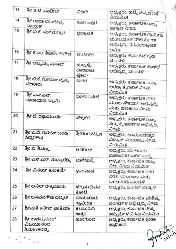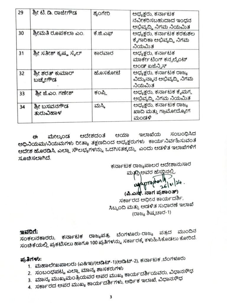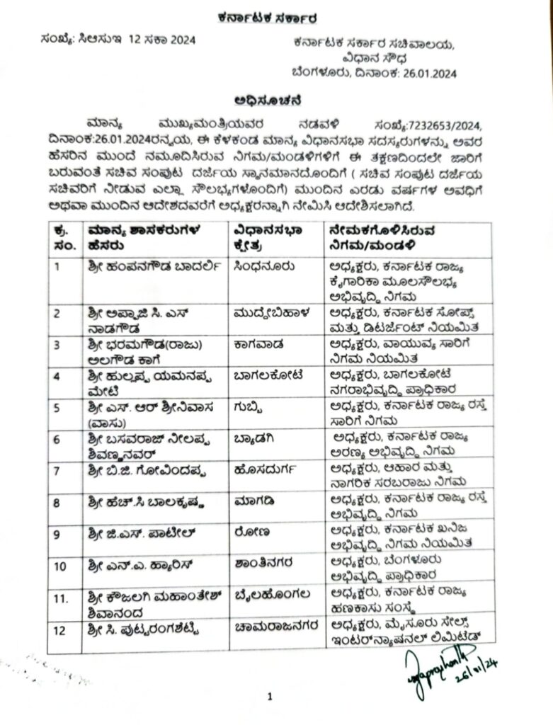 ಈ ಕುರಿತಂತೆ ಮುಖ್ಯಮಂತ್ರಿ ಸಿದ್ಧರಾಮಯ್ಯ ನಡವಳಿಯ ಮೇಲೆ ಸಿಬ್ಬಂದಿ ಮತ್ತು ಆಡಳಿತ ಸುಧಾರಣಾ ಇಲಾಖೆ ಜ.26ರಂದು ಅಧಿಸೂಚನೆ ಹೊರಡಿಸಿದ್ದು, ತಕ್ಷಣದಿಂದ ಜಾರಿಗೆ ಬರುವಂತೆ ಆದೇಸಿದೆ. ಈ ಎಲ್ಲಾ ಹುದ್ದೆಗಳು ಸಂಪುಟದರ್ಜೆ ಸ್ಥಾನಮಾನವನ್ನು ಹೊಂದಿದ್ದು ಇಂದಿನಿಂದ ಮುಂದಿನ ಎರಡು ವರ್ಷದವರೆಗೆ ಅಥವಾ ಮುಂದಿನ ಆದೇಶದವರೆಗೆ ಅಧ್ಯಕ್ಷ ಸ್ಥಾನಕ್ಕೆ ನೇಮಕ ಮಾಡಿ ಆದೇಶಿಸಿದೆ.