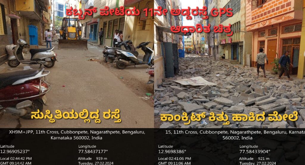 ಬೆಂಗಳೂರು, ಮಾ.02 www.bengaluruwire.com : ಬೃಹತ್ ಬೆಂಗಳೂರು ಕೇಂದ್ರ ಕಚೇರಿ ಕೂಗಳತೆ ದೂರುದಲ್ಲಿ ಚೆನ್ನಾಗಿರೋ ಗಟ್ಟುಮುಟ್ಟಾದ ಕಬ್ಬನ್ ಪೇಟೆ ಅಡ್ಡರಸ್ತೆಯಲ್ಲಿ ಹಾಕಿದ್ದ ಕಾಂಕ್ರಿಟ್ ರಸ್ತೆಯನ್ನು ಅಗೆದು ಅದೇ ಜಾಗದಲ್ಲಿ ಹೊಸ ಕಾಂಕ್ರಿಟ್ ರಸ್ತೆ ಮಾಡೋ ದುಸ್ಸಾಹಸಕ್ಕೆ ಬಿಬಿಎಂಪಿಯ ಎಂಜಿನಿಯರ್ ಗಳು ಮುಂದಾಗಿರೋದನ್ನು ಖುದ್ದು ಬೆಂಗಳೂರು ವೈರ್ ಜಿಪಿಎಸ್ ಆಧಾರಿತ ಚಿತ್ರದೊಂದಿಗೆ ಸೆರೆ ಹಿಡಿದಿದೆ.