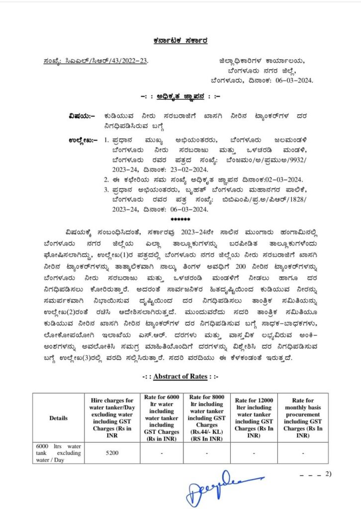 ರಾಜ್ಯ ಸರ್ಕಾರವು 2023-24ನೇ ಸಾಲಿನ ಮುಂಗಾರು ಹಂಗಾಮಿನಲ್ಲಿ ಬೆಂಗಳೂರು ನಗರ ಜಿಲ್ಲೆಯ ಎಲ್ಲಾ ತಾಲ್ಲೂಕುಗಳನ್ನು ಬರಪೀಡಿತ ತಾಲ್ಲೂಕುಗಳೆಂದು ಘೋಷಿಸಲಾಗಿದೆ. ಬೆಂಗಳೂರು ನಗರ ಜಿಲ್ಲೆಯ ನೀರು ಸರಬರಾಜಿಗೆ 200 ಖಾಸಗಿ ನೀರಿನ ಟ್ಯಾಂಕರ್ಗಳನ್ನು ತಾತ್ಕಾಲಿಕವಾಗಿ ನಾಲ್ಕು ತಿಂಗಳ ಅವಧಿಗೆ ಬೆಂಗಳೂರು ನೀರು ಸರಬರಾಜು ಮತ್ತು ಒಳಚರಂಡಿ ಮಂಡಳಿ (BWSSB)ಗೆ ನೀಡಲು ನಿಯೋಜಿಸಲಾಗಿದೆ. ಇದಕ್ಕಾಗಿ ದರ ನಿಗದಿಪಡಿಸಲು ಜಿಲ್ಲಾಧಿಕಾರಿಗಳನ್ನು ಕೋರಿದ್ದರು. ಅದರಂತೆ ಸಾರ್ವಜನಿಕರ ಹಿತದೃಷ್ಟಿಯಿಂದ ಕುಡಿಯುವ ನೀರನ್ನು ಸಮರ್ಪಕವಾಗಿ ನಿಭಾಯಿಸುವ ದೃಷ್ಟಿಯಿಂದ ದರ ನಿಗದಿಪಡಿಸಲು ತಾಂತ್ರಿಕ ಸಮಿತಿಯನ್ನು ರಚಿಸಿ ಆದೇಶಿಸಿದ್ದರು.