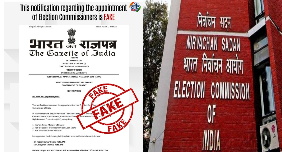 ಪ್ರಧಾನಮಂತ್ರಿ ನರೇಂದ್ರ ಮೋದಿ, ಗೃಹ ಸಚಿವ ಅಮಿತ್ ಷಾ ಹಾಗೂ ಲೋಕಸಭೆಯ ವಿರೋಧ ಪಕ್ಷದ ನಾಯಕರ ಉನ್ನತ ಮಟ್ಟದ ಸಮಿತಿ ಈ ಇಬ್ಬರನ್ನು ಆಯ್ಕೆ ಮಾಡಿದೆ. ಈಗ ರಾಜೇಶ್ ಕುಮಾರ್ ಗುಪ್ತಾ ಮತ್ತು ಪ್ರಿಯಾಂಶ್ ಶರ್ಮಾ ಅವರ ಹೆಸರುಗಳನ್ನು ಕೇಂದ್ರ ಚುನಾವಣಾ ಆಯುಕ್ತ ಅನುಮೋದಿಸಲಾಗಿದೆ. ಮುಖ್ಯ ಚುನಾವಣಾ ಆಯುಕ್ತರು ರಾಜೀವ್ ಕುಮಾರ್ ಅವರ ಸಹಾಯಕರಾಗಿ ಇವರಿಬ್ಬರು ಕಾರ್ಯನಿರ್ವಹಿಸುವರು ಎಂದು ತಿಳಿಸುವ ನಕಲಿ ಗೆಜೆಟ್ ಅಧಿಸೂಚನೆಯಿರುವ ದಾಖಲೆಯೊಂದು ಸಾಮಾಜಿಕ ಮಾಧ್ಯಮದಲ್ಲಿ ಹರಿದಾಡಿತ್ತು. ಇದು ಸತ್ಯಾಂಶದಿಂದ ಕೂಡಿದ ಮಾಹಿತಿಯಲ್ಲ. ಕೇಂದ್ರ ಸರ್ಕಾರ ಈ ರೀತಿಯ ಯಾವುದೇ ಗೆಜೆಟ್ ನೋಟಿಫಿಕೇಶನ್ ಹೊರಡಿಸಿಲ್ಲ ಎಂದು ಪಿಐಬಿ ತನ್ನ ಎಕ್ಸ್ ಖಾತೆಯಲ್ಲಿ ದೃಢಪಡಿಸಿದೆ.