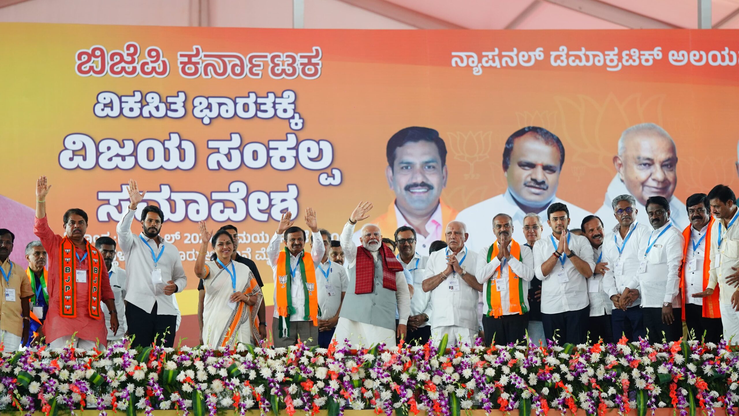 ಕರ್ನಾಟಕದ ಕಾಂಗ್ರೆಸ್ ಸರಕಾರವು ರೈತರ ವಿರೋಧಿ ಎಂದು ಆಕ್ಷೇಪಿಸಿದ ಅವರು, ಕೇಂದ್ರ ಸರಕಾರವು ರೈತರ ಉತ್ಪನ್ನಗಳನ್ನು ಶೇಖರಿಸಲು ಗೋದಾಮುಗಳನ್ನು ನಿರ್ಮಿಸುತ್ತಿದೆ. ರಾಗಿಯನ್ನು ಜಗತ್ತಿನ ವಿವಿಧ ದೇಶಗಳಿಗೆ ಪರಿಚಯಿಸಿದ್ದೇವೆ. ನಿಮ್ಮ ಸಂಕಲ್ಪಗಳನ್ನು ಈಡೇರಿಸಲು ಬಿಜೆಪಿ- ಜೆಡಿಎಸ್ ಒಟ್ಟಾಗಿವೆ. ನಿಮ್ಮ ಕನಸು ನನಸಾಗಿಸುವುದೇ ನನ್ನ ಸಂಕಲ್ಪ. 24*7 ಮತ್ತು 2047 ನನ್ನ ಸಂಕಲ್ಪ. ವಿಕಸಿತ ಭಾರತಕ್ಕಾಗಿ 26ರಂದು ಬಿಜೆಪಿ- ಜೆಡಿಎಸ್ ಅಭ್ಯರ್ಥಿಗಳನ್ನು ಗೆಲ್ಲಿಸಿ ಎಂದು ಮನವಿ ಮಾಡಿದರು. ಗರಿಷ್ಠ ಮತದಾನ ಮಾಡಿ; ಮನೆಮನೆಗೆ ತೆರಳಿ ‘ಮೋದಿಯವರು ಬಂದಿದ್ದರು; ನಿಮಗೆ ನಮಸ್ಕಾರ ಹೇಳಿದ್ದಾರೆ’ ಎಂದು ತಿಳಿಸಲು ವಿನಂತಿಸಿದರು.