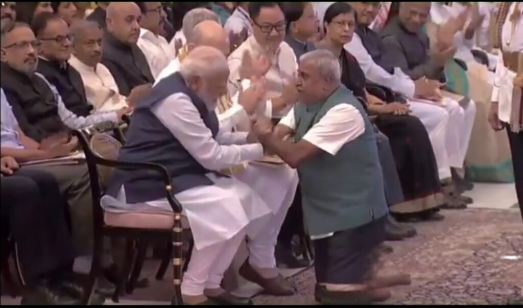 ರಾಷ್ಟ್ರಪತಿ ದ್ರೌಪದಿ ಮುರ್ಮು ಅವರು ಇದೇ ಗುರುವಾರ ರಾಷ್ಟ್ರಪತಿ ಭವನದಲ್ಲಿ 2024 ನೇ ಸಾಲಿನ ಪದ್ಮ ಪ್ರಶಸ್ತಿಗಳನ್ನು ಪ್ರದಾನ ಮಾಡಿದರು. ಸಮಾರಂಭದಲ್ಲಿ ಪ್ರಧಾನಿ ನರೇಂದ್ರ ಮೋದಿ, ಗೃಹ ಸಚಿವ ಅಮಿತ್ ಶಾ, ವಿದೇಶಾಂಗ ಸಚಿವ ಎಸ್ ಜೈಶಂಕರ್ ಮತ್ತಿತರರು ಉಪಸ್ಥಿತರಿದ್ದರು. ಈ ಸಂದರ್ಭದಲ್ಲಿ ಅಂಗವಿಕಲರ ಕಲ್ಯಾಣಕ್ಕಾಗಿ ಶ್ರಮಿಸಿದ ವಿಕಲಚೇತನ ಸಾಮಾಜಿಕ ಕಾರ್ಯಕರ್ತ ಕೆ.ಎಸ್.ರಾಜಣ್ಣ ಅವರಿಗೆ ಪದ್ಮಶ್ರೀ ಪುರಸ್ಕಾರ ನೀಡಿ ಗೌರವಿಸಲಾಯಿತು. ಸನ್ಮಾನ ಸ್ವೀಕರಿಸಲು ಅವರ ಹೆಸರು ಕರೆದಾಗ, ರಾಜಣ್ಣ ಅವರು ತಮ್ಮ ಕುರ್ಚಿಯಿಂದ ಎದ್ದು ಮೊದಲು ಪ್ರಧಾನಿ ನರೇಂದ್ರ ಮೋದಿ ಅವರ ಬಳಿಗೆ ಬಂದು ಅವರ ಕೈ ಕುಲುಕಿ ಸ್ವಾಗತಿಸಿದರು. ಕೆಲ ಸೆಕೆಂಡುಗಳ ರಾಜಣ್ಣನ ಜೊತೆ ಪ್ರಧಾನಿ ಮೋದಿ ಮಾತನಾಡಿದರು.