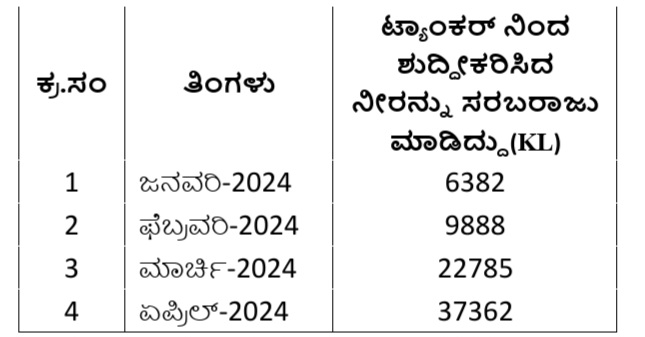 ಜನವರಿಯಿಂದ ಏಪ್ರಿಲ್ ತನಕದ ನಾಲ್ಕು ತಿಂಗಳಲ್ಲಿ ಬಿಡಬ್ಲ್ಯುಎಸ್ ಎಸ್ ಬಿಯು ಒಟ್ಟಾರೆ 7,64,17,000 ಲೀ. ಸಂಸ್ಕರಿಸಿದ ನೀರನ್ನು ವಿವಿಧ ರೀತಿಯ ಗ್ರಾಹಕರಿಗೆ ಪೂರೈಕೆ ಮಾಡಿದೆ.