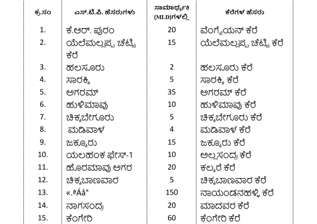 (ಕೋಷ್ಠಕದಲ್ಲಿನ 13ನೇ ಕ್ರಮಸಂಖ್ಯೆ ವಿ ವ್ಯಾಲಿಯಿಂದ ನಾಯಂಡಹಳ್ಳಿ ಕೆರೆಗೆ ಸಂಸ್ಕರಿತ ನೀರು ಪೂರೈಕೆಯಾಗುತ್ತಿದೆ.)