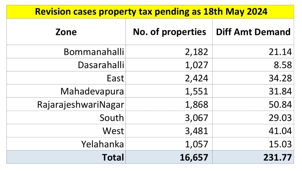 ಪಾಲಿಕೆಯ 8 ವಲಯಗಳ ವ್ಯಾಪ್ತಿಯ ಪೈಕಿ ಮಹದೇವಪುರ ವಲಯದಲ್ಲಿ ಪ್ರಾಪರ್ಟಿ ಟ್ಯಾಕ್ಸ್ ಕಟ್ಟದವರ ಸಂಖ್ಯೆ ಅತಿಹೆಚ್ಚಿದೆ. ಒಟ್ಟು 76,132 ಸ್ವತ್ತುಗಳಿಂದ 174,88 ಕೋಟಿ ರೂ. ಪಾಲಿಕೆ ಖಜಾನೆಗೆ ಬರಬೇಕಿದೆ. ಇನ್ನು ಕಡಿಮೆ ತೆರಿಗೆ ಘೋಷಿಸಿಕೊಂಡು ಪರಿಷ್ಕರಣೆ ತೆರಿಗೆಯಲ್ಲಿ ವ್ಯತ್ಯಾಸದ ಮೊತ್ತ ಪಾವತಿಸಬೇಕಿರುವ ಪ್ರಕರಣ ಬೆಂಗಳೂರು ಪಶ್ಚಿಮ ವಲಯದಲ್ಲಿ ಹೆಚ್ಚಿದೆ. ಒಟ್ಟು 3,481 ಸ್ವತ್ತುಗಳಿಂದ 41.04 ಕೋಟಿ ರೂ. ವ್ಯತ್ಯಾಸದ ಬೇಡಿಕೆ ಮೊತ್ತ ಪಾಲಿಕೆ ಕಂದಾಯ ಇಲಾಖೆಗೆ ಬರಬೇಕಿದೆ.