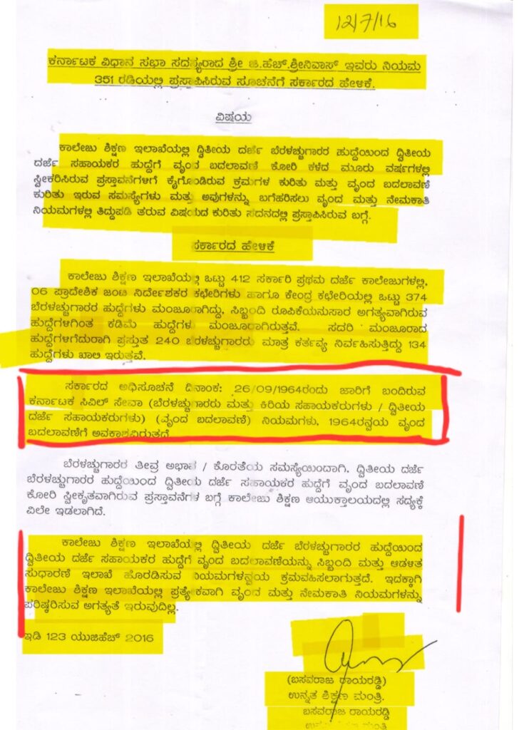 2016ರ ಜುಲೈ 12ರಂದು ಅಧಿವೇಶನದಲ್ಲಿ ಶಾಸಕ ಬಿ.ಎಚ್.ಶ್ರೀನಿವಾಸ್ ವಿಧಾನಸಭೆಯಲ್ಲಿ ಕೇಳಿದ ಚುಕ್ಕೆ ಗುರುತಿನ ಪ್ರಶ್ನೆಗೆ (ಇಡಿ 123 ಯುಜಿಎಚ್ 2016) ಸದನದಲ್ಲಿ ಉತ್ತರ ನೀಡಿದ್ದ ಆಗಿನ ಉನ್ನತ ಶಿಕ್ಷಣ ಸಚಿವ ಬಸವರಾಜ ರಾಯರೆಡ್ಡಿ, “ಕಾಲೇಜು ಶಿಕ್ಷಣ ಇಲಾಖೆಯಲ್ಲಿ ದ್ವಿತೀಯ ದರ್ಜೆ ಬೆರಳಚ್ಚುಗಾರರ ಹುದ್ದೆಯಿಂದ ದ್ವಿತೀಯ ದರ್ಜೆ ಸಹಾಯಕರ ಹುದ್ದೆಗೆ ವೃಂದ ಬದಲಾವಣೆಯನ್ನು ಸಿಬ್ಬಂದಿ ಮತ್ತು ಆಡಳಿತ ಸುಧಾರಣೆ ಇಲಾಖೆ ಹೊರಡಿಸುವ ನಿಯಮಗಳನ್ವಯ ಕ್ರವಹಿಸಲಾಗುತ್ತದೆ. ಇದಕ್ಕಾಗಿ ಕಾಲೇಜು ಶಿಕ್ಷಣ ಇಲಾಖೆಯಲ್ಲಿ ಪ್ರತ್ಯೇಕವಾಗಿ ವೃಂದ ಮತ್ತು ನೇಮಕಾತಿ ನಿಯಮಗಳನ್ನು ಪರಿಷ್ಕರಿಸುವ ಅಗತ್ಯತೆ ಇರುವುದಿಲ್ಲ” ಎಂದು ಹೇಳಿದ್ದರು.
