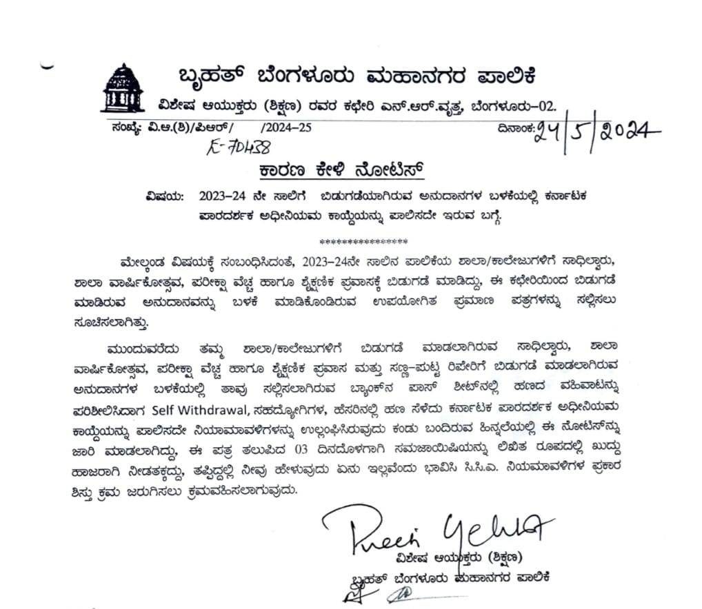 ಬಿಬಿಎಂಪಿ ಶಾಲಾ ಮತ್ತು ಕಾಲೇಜಿನ 33 ಜನ ಪ್ರಾಂಶುಪಾಲರು ಹಾಗೂ ಶಿಕ್ಷಕರು ಕಾನೂನು ಉಲ್ಲಂಘಿಸಿ ತಾವೇ ಸ್ವತಃ ಹಾಗೂ ಸಹೋದ್ಯೋಗಿಗಳಿಂದ ಹಣವನ್ನು ವಿತ್ ಡ್ರಾ ಮಾಡಿರುವ ಪ್ರಕರಣದಲ್ಲಿ ವಿಶೇಷ ಆಯುಕ್ತೆ ಪ್ರೀತಿ ಗೆಹ್ಲೋಟ್ ಮೇ.24ರಂದು ಸೂಕ್ತ ಸಮಜಾಯುಷಿಯನ್ನು ಲಿಖಿತ ರೂಪದಲ್ಲಿ ನೀಡುವಂತೆ ಕಾರಣ ಕೇಳಿ ನೋಟಿಸ್ ನೀಡಿದ್ದಾರೆ. ಈ 33 ಶಿಕ್ಷಕರು ಸಾರ್ವಜನಿಕ ಸಂಗ್ರಹಣೆಗಳಲ್ಲಿ ಪಾರದರ್ಶಕತೆ ಅಧಿನಿಯಮ (KTTP Act) ಉಲ್ಲಂಘಿಸಿ ತಮಗೆ ಬೇಕಾದಂತೆ ಹಣ ಬಳಕೆ ಮಾಡಿಕೊಂಡಿದ್ದಾರೆಂದು ಈ ನೋಟಿಸ್ ನೀಡಲಾಗಿದೆ. ಮೇ.24ರಂದೇ ಈ ಶೋಕಾಸ್ ನೀಡಿ, ಆ ಪತ್ರ ತಲುಪಿದ ಮೂರು ದಿನಗಳ ಒಳಗಾಗಿ ಉತ್ತರ ನೀಡುವಂತೆ ತಿಳಿಸಿದ್ದರೂ, ಮೇ.30ರ ತಾರೀಖಿನವರೆಗೂ ಒಬ್ಬೇ ಒಬ್ಬ ಶಿಕ್ಷಕರು ಸೂಕ್ತ ಸಮಜಾಯುಷಿಯನ್ನು ನೀಡದಿರುವುದು ಹಲವು ಅನುಮಾನಗಳಿಗೆ ಕಾರಣವಾಗಿದೆ.