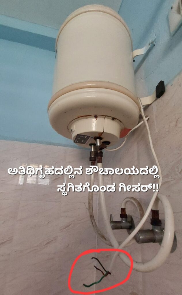 “ಇಡೀ ಕಟ್ಟಡದಲ್ಲಿ ಸರಿಯಾಗಿ ಎಲೆಕ್ಟ್ರಿಕ್ ವೈರಿಂಗ್ ಮಾಡಿಲ್ಲ. ಹಾಗಾಗಿ ಕೆಲವು ಕಡೆ ಸ್ವಿಚ್ ಗಳನ್ನು ಮುಟ್ಟಿದರೂ ಕರೆಂಟ್ ಶಾಕ್ ಹೊಡೆಯುತ್ತದೆ. ಇದೇ ಕಾರಣಕ್ಕೆ ಇಡೀ ಕಟ್ಟಡದಲ್ಲಿ ಗೀಸರ್ ಅಳವಡಿಸಿದ ಸ್ವಿಚ್ ಗಳನ್ನು ತೆಗೆಯಲಾಗಿದೆ. ಹೀಗಾಗಿ ರೂಮ್ ಪಡೆಯುವರಿಗೆ ಸ್ನಾನಕ್ಕೆ ಬಿಸಿನೀರು ಲಭ್ಯವಿರಲ್ಲ” ಎಂದು ಅತಿಥಿಗೃಹದ ಸಿಬ್ಬಂದಿಯೊಬ್ಬರು ಬೆಂಗಳೂರು ವೈರ್ ಗೆ ತಿಳಿಸಿದ್ದಾರೆ.