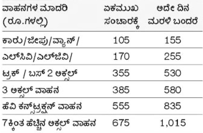 ದಿನದ 24 ಗಂಟೆಯಲ್ಲಿ ಕಾರಿನ ಒಂದು ಕಡೆ ಸಂಚಾರಕ್ಕೆ 105 ರೂಪಾಯಿ, ಅದೇ ದಾರಿಯಲ್ಲಿ ಹೋಗಿ ವಾಪಸ್ ಬರುವುದಾದರೆ 155 ರೂಪಾಯಿ ನಿಗದಿ ಮಾಡಿದೆ. ಮಾಸಿಕ ಪಾಸ್ನಲ್ಲಿ 50 ಸಲ ಒನ್ ವೇ ಪ್ರಯಾಣಕ್ಕೆ 3,470 ರೂಪಾಯಿ ನಿಗದಿ ಮಾಡಿದೆ. ಅಲ್ಲದೇ ಭಾರಿ ವಾಹನ ಸೇರಿದಂತೆ ವಿವಿಧ ವಾಹನಗಳಿಗೆ ಬೇರೆ ಬೇರೆ ಶುಲ್ಕ ನಿಗದಿಪಡಿಸಿದೆ.