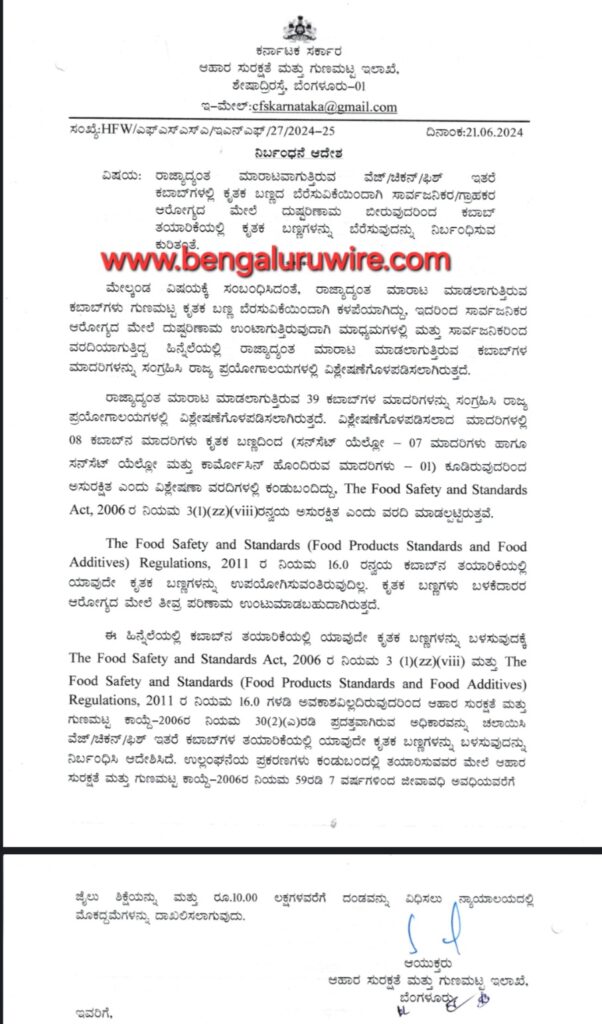 ಕೃತಕ ಬಣ್ಣ ಬೆರಸುವಿಕೆಯಿಂದಾಗಿ ಚಿಕನ್ ಕಬಾಬ್ ಕಳಪೆಯಾಗಿದ್ದು, ಇದರಿಂದ ಸಾರ್ವಜನಿಕರ ಆರೋಗ್ಯದ ಮೇಲೆ ದುಷ್ಪರಿಣಾಮ ಉಂಟಾಗುತ್ತಿರುವುದು ಕಂಡುಬಂದ ಹಿನ್ನೆಲೆಯಲ್ಲಿ ಚಿಕನ್ ಕಬಾಬ್, ಫಿಶ್ ಆಹಾರಗಳಲ್ಲಿ ಕೃತಕ ಬಣ್ಣ ಬೆರಸುವಿಕೆಯನ್ನ ನಿಷೇಧಿಸಿ ಆಹಾರ ಸುರಕ್ಷತಾ ಆಯುಕ್ತರು ಆದೇಶ ಹೊರಡಿಸಿದ್ದಾರೆ.
