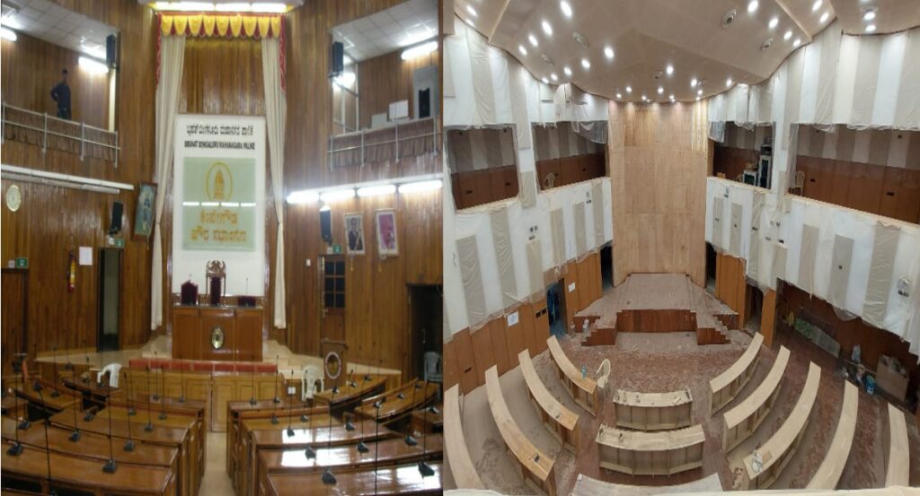 ಬೆಂಗಳೂರು, ಜು.01 www.bengaluruwire.com : ರಾಜಧಾನಿ ಬೆಂಗಳೂರಿನ ಸ್ಥಳೀಯಾಡಳಿತ ಸಂಸ್ಥೆ ಬೃಹತ್ ಬೆಂಗಳೂರು ಮಹಾನಗರ ಪಾಲಿಕೆಯಲ್ಲಿ ಅಕ್ಟೋಬರ್ ವೇಳೆಗೆ ಚುನಾವಣೆ ನಡೆಯುವ ಬಗ್ಗೆ ರಾಜ್ಯದಲ್ಲಿನ ಆಡಳಿತರೂಢ ಕಾಂಗ್ರೆಸ್ ನಾಯಕರು ಹೇಳಿಕೆ ನೀಡುತ್ತಿದ್ದಾರೆ. ಒಂದೊಮ್ಮೆ 225 ವಾರ್ಡ್ ಗಳಿಗೆ ಪಾಲಿಕೆ ಚುನಾವಣೆ ನಡೆದಲ್ಲಿ, ಮಾಸಿಕ ಸಭೆ ನಡೆಯಲು ಕೌನ್ಸಿಲ್ ಸಭಾಂಗಣ ನವವಧುವಿನಂತೆ ಸಿದ್ಧವಾಗುತ್ತಿದೆ. ಜುಲೈ ಅಂತ್ಯದ ವೇಳೆಗೆ ಹೊಸ ರೂಪದ ನಾಡಪ್ರಭು ಕೆಂಪೇಗೌಡ ಪೌರಸಭಾಂಗಣ ಸಿದ್ಧವಾಗಲಿದೆ.