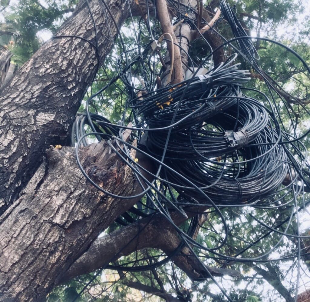 ಮರವೊಂದರ ಮೇಲೆ ಅನಧಿಕೃತವಾಗಿ ಕೇಬಲ್ ಗಳನ್ನು ಹಾಕಿರುವುದು ಬೆಂಗಳೂರಿನಲ್ಲಿ ಸಾಮಾನ್ಯ ವಿದ್ಯಮಾನ ಎಂಬಂತಾಗಿರುವುದು ದುರದೃಷ್ಟಕರ.