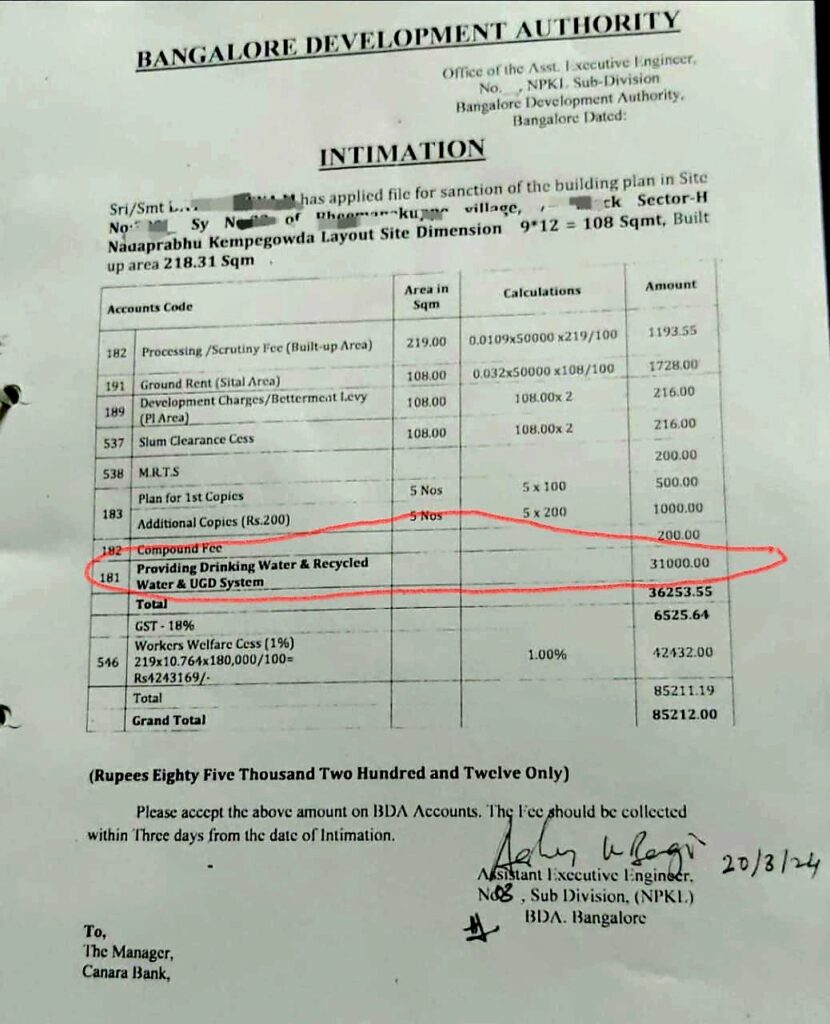 ಬಿಡಿಎ ನಿವೇಶನ ಹಂಚಿಕೆ ಮಾಡುವಾಗ ಕುಡಿಯುವ ನೀರು, ಸಂಸ್ಕರಿತ ನೀರು ಹಾಗೂ ಯುಜಿಡಿ ಸಂಪರ್ಕ ಕಲ್ಪಿಸಲು ಒಟ್ಟಾರೆ ನಿವೇಶನ ಮೊತ್ತದಲ್ಲೇ ಕಟ್ಟಿಸಿಕೊಂಡಿರುವುಕ್ಕೆ ದಾಖಲೆ.