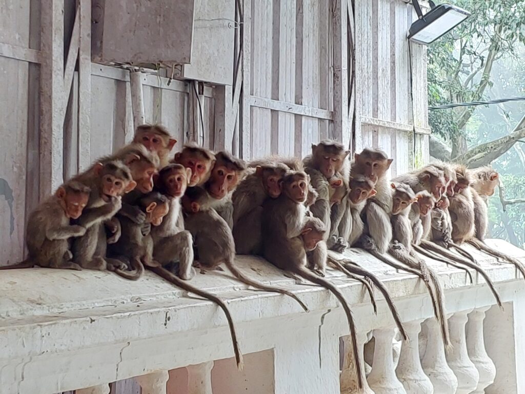 ಒಂದೇ ಸಮನೆ ಮಳೆ ಗಾಳಿ, ಮಂಜಿಗೆ ನಂದಿಬೆಟ್ಟದಲ್ಲಿನ ಮಂಗಗಳು, ರಕ್ಷಣೆಗಾಗಿ ಗಿರಿಧಾಮದ ಅತಿಥಿ ಗೃಹದ ಮಾಡಿನ ಕೆಳಗೆ ಒಟ್ಟಿಗೇ ನೆಲೆಸಿ, ಬೆಚ್ಚನೆಯ ಅನುಭವ ಪಡೆಯುತ್ತಿವೆ.
