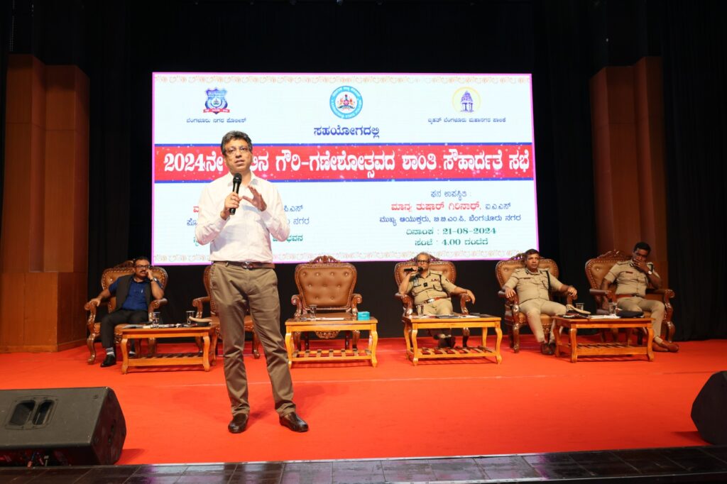 ಗಣೇಶ ಚತುರ್ಥಿ ಆಚರಣೆ ಸಂದರ್ಭದಲ್ಲಿ ಕಾನೂನು ಮತ್ತು ಸುವ್ಯವಸ್ಥೆ ಕಾಪಾಡುವ ಸಲುವಾಗಿ ಬೃಹತ್ ಬೆಂಗಳೂರು ಮಹಾನಗರ ಪಾಲಿಕೆ ಮತ್ತು ಬೆಂಗಳೂರು ನಗರ ಪೊಲೀಸ್ ಜಂಟಿ ಸಹಯೋಗದಲ್ಲಿ ಬುಧವಾರ ಪುಟ್ಟಣ್ಣ ಚೆಟ್ಟಿ ಪುರಭವನ( Town hall)ದಲ್ಲಿ ನಡೆದ “ಶಾಂತಿ ಸೌಹಾರ್ದತೆ ಸಭೆಯನ್ನು ಉದ್ದೇಶಿಸಿ ಅವರು ಮಾತನಾಡಿದರು.