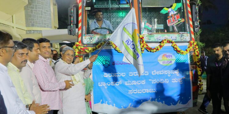 ನಂದಿನಿ ತುಪ್ಪವಿರುವ ಟ್ಯಾಂಕರ್ ತಿರುಪತಿ ತಿರುಮಲಕ್ಕೆ ಸಾಗಿಸಲು ಸಿಎಂ ಗೃಹ ಕಚೇರಿ ಕೃಷ್ಣಾದಲ್ಲಿ ಮುಖ್ಯಮಂತ್ರಿ ಸಿದ್ಧರಾಮಯ್ಯ ಬುಧವಾರ ಚಾಲನೆ ನೀಡಿದ್ದಾರೆ. ಕಹಾಮದಿಂದ 2013-14ನೇ ಸಾಲಿನಿಂದ 2021-22ರ ವರೆವಿಗೂ 5000 ಮೆ.ಟನ್ ತುಪ್ಪವನ್ನು ತಿರುಮಲ ತಿರುಪತಿ ದೇವಸ್ಥಾನಕ್ಕೆ ಸರಬರಾಜು ಮಾಡಲಾಗಿರುತ್ತದೆ.