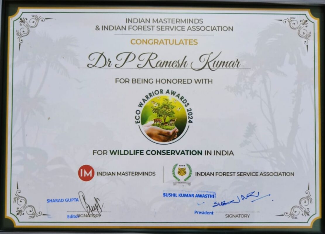 ಬೆಂಗಳೂರು, ಸೆ.19 www.bengaluruwire.com : “ಭಾರತದಲ್ಲಿ ವನ್ಯಜೀವಿ ಸಂರಕ್ಷಣೆ”ಯಲ್ಲಿ ಗಣನೀಯ ಕೊಡುಗೆ ನೀಡಿದ ಮೈಸೂರು ಹುಲಿ ಸಂರಕ್ಷಣಾ ಯೋಜನೆಯ ಅರಣ್ಯ ಸಂರಕ್ಷಣಾಧಿಕಾರಿ ಡಾ.ಪಿ.ರಮೇಶ್ ಕುಮಾರ್ ಅವರಿಗೆ ಭಾರತೀಯ ಅರಣ್ಯ ಸೇವೆ ಸಂಘ ಹಾಗೂ ಇಂಡಿಯನ್ ಮಾಸ್ಟರ್ ಮೈಂಡ್ಸ್ ಕೊಡ ಮಾಡುವ “ಇಕೋ ವಾರಿಯರ್ ಅವಾರ್ಡ್ 2024” (“Eco Warrior Award 2024”) ರಾಷ್ಟ್ರಮಟ್ಟದ ಪ್ರತಿಷ್ಠಿತ ಪ್ರಶಸ್ತಿ ನೀಡಿ ಗೌರವಿಸಿದೆ.