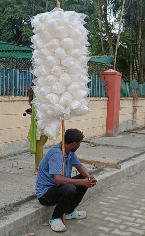 ಹಳ್ಳಿಗಳಲ್ಲಿ ಸೈಕಲ್ ಮೇಲೆ ಗಾಜಿನ ಡಬ್ಬಿಗಳಲ್ಲಿ ತುಂಬಿಕೊಂಡು ಬರುತ್ತಿದ್ದ, ಬಾಂಬೆ ಮಿಠಾಯಿ ಅಣ್ಣ… ನಾಲ್ಕಾಣೆ, ಎಂಟಾಣೆಗೆ ಒಂದಷ್ಟು ಎಳೆಗಳನ್ನ ಕೈಗೆ ಕೈಗಡಿಯಾರ ಮತ್ತಿರ ವಿನ್ಯಾಸ ಮಾಡಿ ಕೈಗೆ ಕಟ್ಟುತ್ತಿದ್ದ. ಅದನ್ನ ಸ್ವಲ್ಪ ಸ್ವಲ್ಪವೇ ಕಿತ್ತುಕೊಂಡು ನಾಲಗೆಯ ಮೇಲೆ ಇಟ್ಟುಕೊಂಡು, ಬಾಯಿಯ ಒಳಗೆ ಮೇಲ್ಭಾಗಕ್ಕೆ ಒತ್ತಿಕೊಂಡರೆ ಅದರಿಂದ ಸಿಗುತಿದ್ದ ಆನಂದ ವರ್ಣನಾತೀತ.