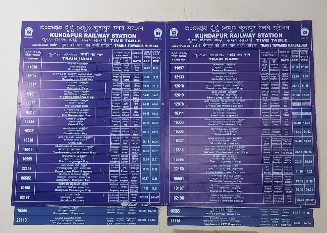 ಕುಂದಾಪುರ ರೈಲ್ವೆ ನಿಲ್ದಾಣಕ್ಕೆ ಬಂದು ಹೋಗುವ ರೈಲುಗಳ ಪಟ್ಟಿ.