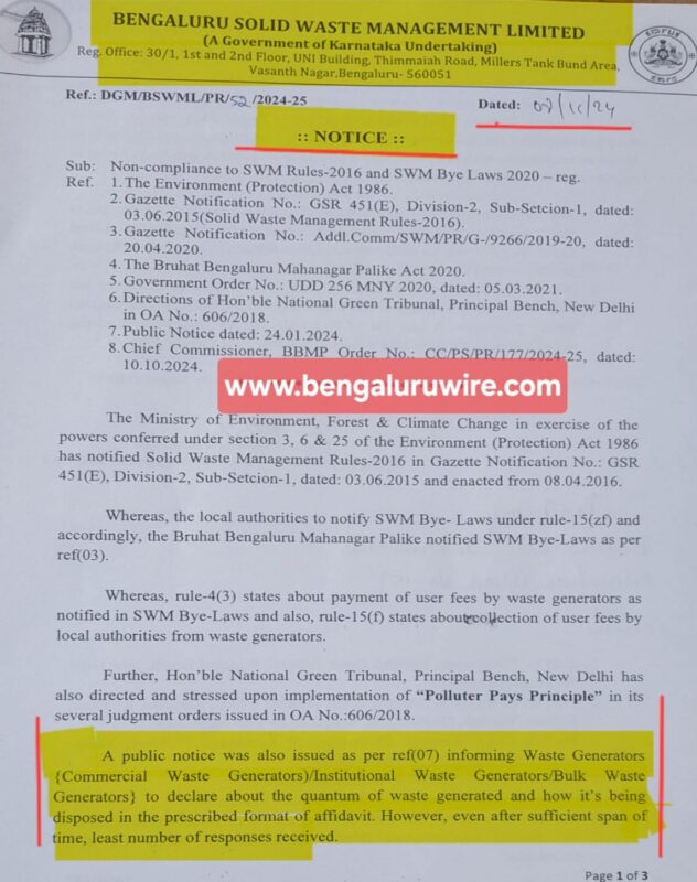 ಈ ಮಧ್ಯೆ ಬೆಂಗಳೂರಿನಲ್ಲಿನ ಬೃಹತ್ ತ್ಯಾಜ್ಯ ಉತ್ಪಾದಿಸುವ (ಪ್ರತಿ ದಿನ 100 ಕೆಜಿಗಿಂತ ಹೆಚ್ಚಿನ ತ್ಯಾಜ್ಯ ಉತ್ಪಾದಿಸುವವರು ಅಥವಾ 50,000 ಚದರ ಅಡಿ ವಿಸ್ತೀರ್ಣದ ಅಥವಾ 100 ಯೂನಿಟ್ ಗಿಂತ ಹೆಚ್ಚಿನ ಕಟ್ಟಡಗಳಿಗೆ) ಅಪಾರ್ಟ್ ಮೆಂಟ್ ಗಳು, ದೊಡ್ಡ ದೊಡ್ಡ ವಾಣಿಜ್ಯ ಸಂಕೀರ್ಣ ಮತ್ತಿತರ ಬೃಹತ್ ತ್ಯಾಜ್ಯ ಉತ್ಪಾದಕರಿಗೆ ಬೆಂಗಳೂರು ಘನತ್ಯಾಜ್ಯ ನಿರ್ವಹಣಾ ಕಂಪನಿಯು ನೋಟಿಸ್ ಜಾರಿ ಮಾಡುತ್ತಿದೆ. ಬೃಹತ್ ತ್ಯಾಜ್ಯ ಉತ್ಪಾದಕರು ಪಾಲಿಕೆ ಸೇವೆ ಬಳಸಿಕೊಳ್ಳದೆ, ಸ್ವಯಂ ಗೊಬ್ಬರ ತಯಾರಿಕೆ ಅಥವಾ ನೋಂದಾಯಿತರಲ್ಲದ ತ್ಯಾಜ್ಯ ಸಂಸ್ಕರಣೆದಾರರ ಮುಖೇನ ತ್ಯಾಜ್ಯ ವಿಲೇವಾರಿ ಮಾಡುತ್ತಿರುವ ಬಗ್ಗೆ ನೋಟಿಸ್ ನೀಡಿದ 7 ದಿನಗಳ ಒಳಗಾಗಿ ಅಫಿಡೆವಿಟ್ ಹಾಗೂ ಇದೇ 2024ರ ಏಪ್ರಿಲ್ 1 ರಿಂದ ಜಾರಿಗೆ ಬರುವಂತೆ ಬಳಕೆದಾರರ ಶುಲ್ಕವನ್ನು ಬಿಬಿಎಂಪಿಗೆ ನೀಡುವಂತೆ ನೋಟಿಸ್ ನೀಡಲಾಗುತ್ತಿದೆ.