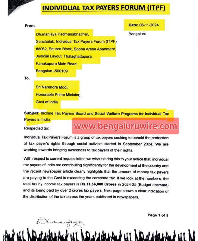 ಸೆಪ್ಟೆಂಬರ್ 2024 ರಲ್ಲಿ ತನ್ನ ಪ್ರಯಾಣವನ್ನು ಪ್ರಾರಂಭಿಸಿದ ವೇದಿಕೆಯು ಸಾಮಾಜಿಕ ಕ್ರಿಯಾಶೀಲತೆಯ ಮೂಲಕ ತೆರಿಗೆದಾರರ ಹಕ್ಕು (Tax Payer Rights)ಗಳನ್ನು ರಕ್ಷಿಸುವ ಗುರಿಯನ್ನು ಹೊಂದಿದೆ. ತೆರಿಗೆ ಪಾವತಿದಾರರು ದೇಶದ ಅಭಿವೃದ್ಧಿಗೆ ನೀಡುತ್ತಿರುವ ಕೊಡುಗೆ, ಇದೇ ಸಂದರ್ಭದಲ್ಲಿ ಅನುಭವಿಸುತ್ತಿರುವ ಸಮಸ್ಯೆ- ಸವಾಲುಗಳು, ಆದಾಯ ತೆರಿಗೆ ಪಾವತಿದಾರರ ಮಂಡಳಿ ಸ್ಥಾಪನೆಯ ಅಗತ್ಯ ಹಾಗೂ ಅವರಿಗಾಗಿ ಕಲ್ಯಾಣ ಕಾರ್ಯಕ್ರಮ ರೂಪಿಸುವ ಬಗ್ಗೆ ವೇದಿಕೆಯ ಸಂಚಾಲಕ ಧನಂಜಯ ಪದ್ಮನಾಭಾಚಾರ್ ಪ್ರಧಾನಮಂತ್ರಿ ನರೇಂದ್ರ ಮೋದಿಯವರಿಗೆ ನ.06 ರಂದು ಬರೆದ ಪತ್ರದಲ್ಲಿ ತಿಳಿಸಿದ್ದಾರೆ.