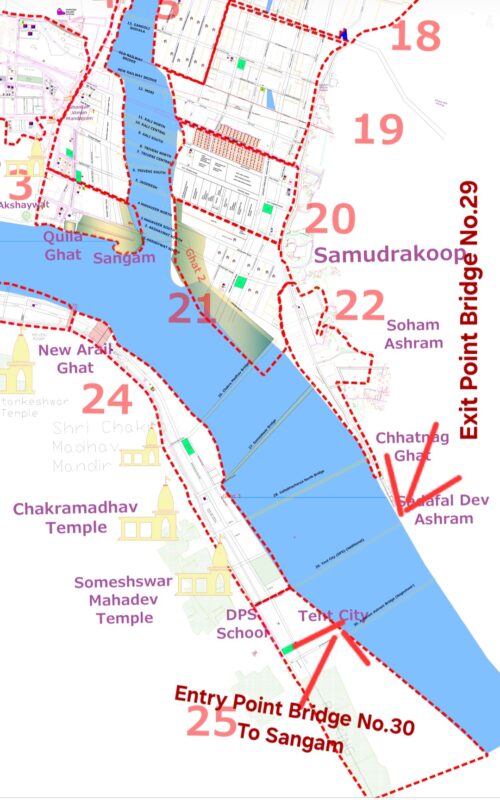 ಜನದಟ್ಟಣೆಯನ್ನು ತಡೆಗಟ್ಟಲು, ಭಕ್ತರನ್ನು ಅವರ ಪ್ರವೇಶ ಸ್ಥಳಗಳ ಆಧಾರದ ಮೇಲೆ ನಿರ್ದಿಷ್ಟ ಘಾಟ್ಗಳಿಗೆ ನಿರ್ದೇಶಿಸಲಾಗುತ್ತದೆ. ಅರೈಲ್ನಿಂದ ಪ್ರವೇಶಿಸುವವರು ಅರೈಲ್ ಘಾಟ್ನಲ್ಲಿ ಸ್ನಾನ ಮಾಡುತ್ತಾರೆ ಮತ್ತು ಝುಸಿಯಿಂದ ಬರುವ ಪ್ರವಾಸಿಗರು ಝುಸಿ ಘಾಟ್ ಅನ್ನು ಬಳಸುತ್ತಾರೆ.