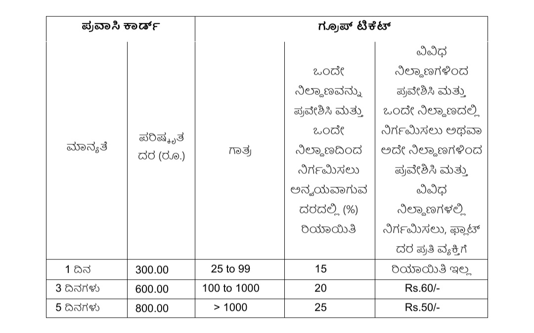 ಪರಿಷ್ಕೃತ ಪ್ರವಾಸಿ ಕಾರ್ಡ್ (ದಿನದ ಪಾಸ್ಗಳು) ಮತ್ತು ಗ್ರೂಪ್ ಟಿಕೆಟ್ ದರಗಳು ಈ ಕೆಳಕಂಡಂತಿವೆ :