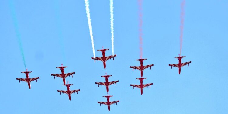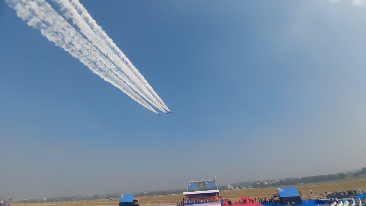 ಬೆಂಗಳೂರಿನ ಯಲಹಂಕ ವಾಯುಪಡೆ ನೆಲೆಯಲ್ಲಿ ಇಂದಿನಿಂದ 5 ದಿನಗಳ ಕಾಲ ಏರೋ ಇಂಡಿಯಾ ಶೋ ಆರಂಭವಗಿದ್ದು, ಉದ್ಘಟನಾ ಕಾರ್ಯಕ್ರಮದ ಭಾಗವಾಗಿ ಯುದ್ಧ ವಿಮಾನಗಳ ಆಕರ್ಷಕ ಕಸರತ್ತು ಎಲ್ಲರನ್ನು ರಂಜಿಸಿತು. ಆಕಾಶಗಂಗೆ ತಂಡದಿಂದ ಪ್ಯಾರಾಚೂಟ್ ಗಳಿಂದ ಸೈನಿಕರು ವಾಯುನೆಲೆಯ ರನ್ ವೇ ಬಳಿ ತ್ರಿವರ್ಣ ಧ್ವಜ ಹೊತ್ತು ಇಳಿದರು. ತೇಜಸ್ ಯುದ್ಧವಿಮಾನ ಫಾರ್ಮೇಶನ್, ಸುಖೋಯ್ ಎಂಕೆ35 ಆಗಸದಲ್ಲಿ ತ್ರಿಶೂಲ್ ವಿನ್ಯಾಸ ಮೂಡಿಸಿತು, ದ್ರೋಣಿಯರ್, ಜಾಗ್ವಾರ್ ಯುದ್ಧ ವಿಮಾನ, ಹಗು ಯುದ್ಧ ಹೆಲಿಕಾಪ್ಟರ್, ಜಾಗ್ವಾರ್ ಫಾರ್ಮೇಶನ್, ಎಂಬ್ರಿಯರ್ ಸಂವಹನ ವಿಮಾನ ಸೇರಿದಂತೆ ಹಲವು ವಿಮಾನ, ಹೆಲಿಕಾಪ್ಟರ್ ಗಳು ನೀಲಿ ಆಗಸದಲ್ಲಿ ಪ್ರದರ್ಶನ ತೋರಿದವು.