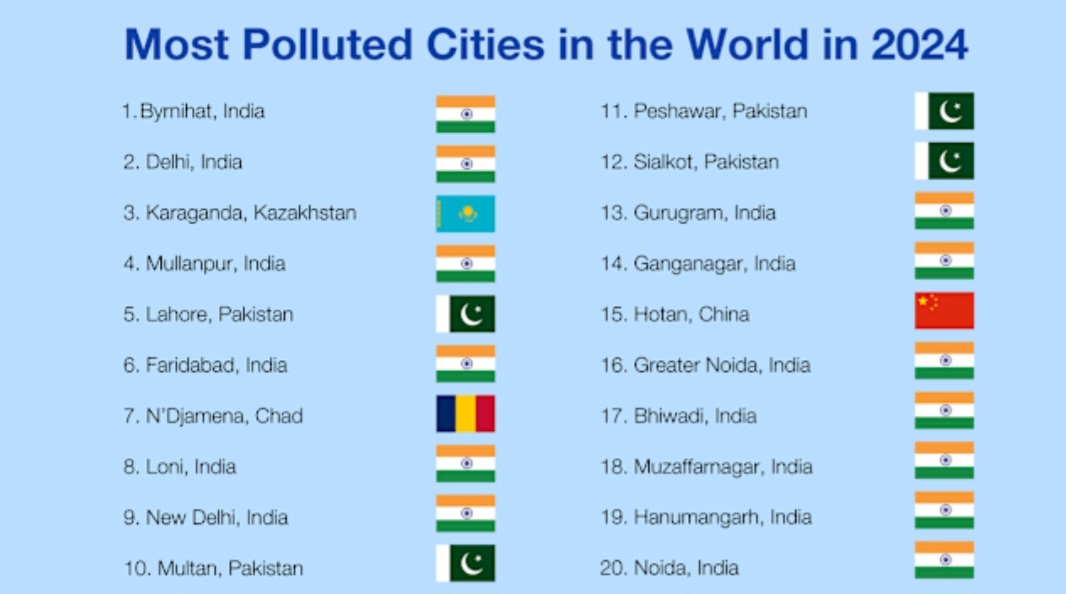 ಸ್ವಿಜರ್ ಲ್ಯಾಂಡಿ (Switzerland)ನ ವಾಯು ಗುಣಮಟ್ಟ ತಂತ್ರಜ್ಞಾನ ಕಂಪನಿ ಐಕ್ಯೂಏರ್ (IQAir) ನ ವಿಶ್ವ ವಾಯು ಗುಣಮಟ್ಟ ವರದಿ 2024 (World Air Quality Report 2024)ರಲ್ಲಿ ಭಾರತದ ವಾಯು ಮಾಲಿನ್ಯದ ಗುಣಮಟ್ಟವನ್ನು ಎತ್ತಿ ತೋರಿಸಿದೆ. ವಿಶ್ವದ 20 ಅತ್ಯಂತ ಕಲುಷಿತ ನಗರಗಳ ಪೈಕಿ 13 ನಗರಗಳು ಭಾರತದಲ್ಲಿವೆ ಎಂದು ವರದಿ ಬಹಿರಂಗಪಡಿಸಿದೆ. ಮೇಘಾಲಯದ ಬೈನಿರ್ಹತ್ ಜಾಗತಿಕವಾಗಿ ಅತ್ಯಂತ ಕಲುಷಿತ ನಗರವಾಗಿದೆ ಎಂದು ರಿಪೋರ್ಟ್ ಹೊರಗೆಡವಿದೆ.